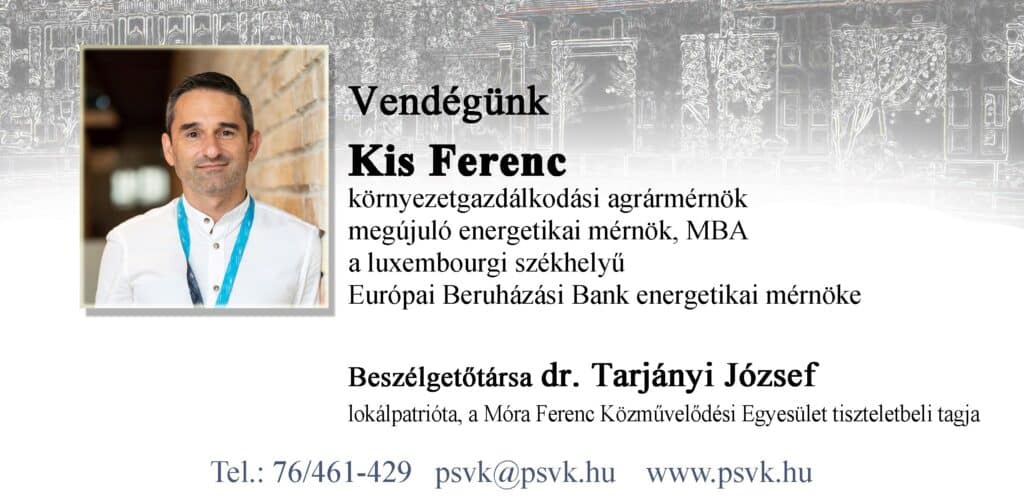 Kis Ferenc, a Kiskunfélegyházáról indult környezetgazdálkodási agrármérnök és megújuló energetikai szakember ma már a luxembourgi székhelyű Európai Beruházási Bank energetikai mérnökeként dolgozik, mégis büszkén vallja félegyházi gyökereit. November 4-én, kedden 17 órakor a Városi Könyvtár rendezvénytermében dr. Tarjányi József beszélget...