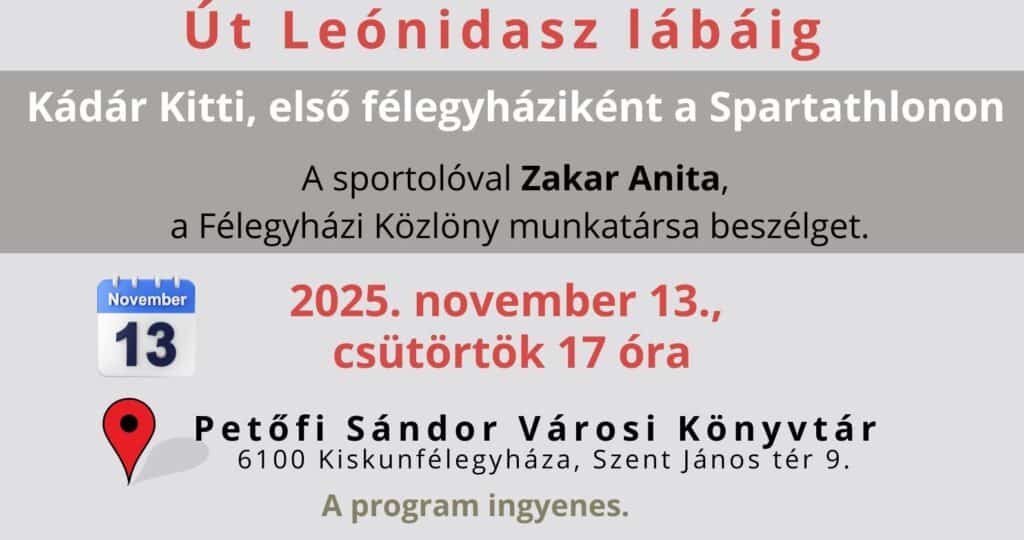 Út Leónidasz lábáig – Kádár Kitti első félegyháziként a Spartathlonon címmel szerveznek beszélgetést november 13-án, csütörtökön 17 órától a Petőfi Sándor Városi Könyvtárban. A különleges esten a világ egyik legkeményebb ultrafutó-versenyét teljesítő sportolóval Zakar Anita, a Félegyházi Közlöny munkatársa beszélget.