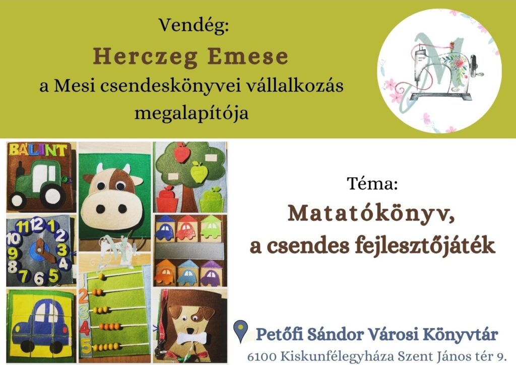 Herczeg Emese, a Mesi csendeskönyvei megálmodója érkezik november 18-án a Kiskunfélegyházi Petőfi Sándor Városi Könyvtár baba-mama klubjába, a Betűbölcsibe. A délelőtt ezúttal a matatókönyvek köré szerveződik. Azokhoz a különleges, csendes fejlesztőjátékokhoz, amik egyszerre ragadják meg a gyerekek figyelmét és segítik...