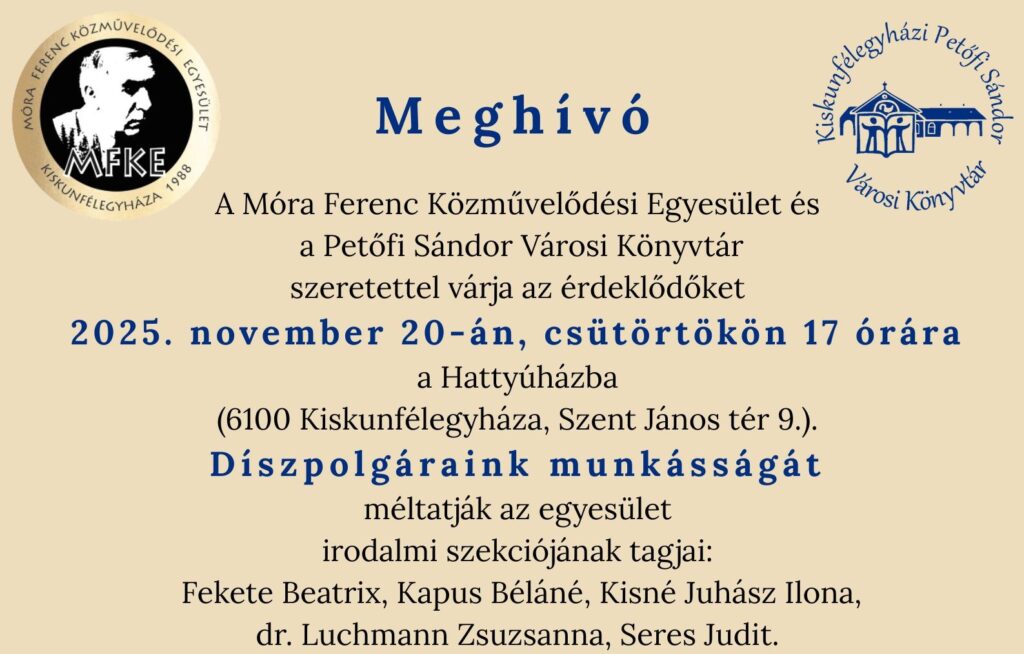 A Kiskunfélegyházi Petőfi Sándor Városi Könyvtár november 20-án a Móra Ferenc Közművelődési Egyesület Irodalmi Szekcióját látja vendégül. A szekció tagjai ezúttal évfordulós díszpolgáraink munkásságára emlékeznek, rövid ismertetésekkel és felolvasásokkal idézve fel életútjukat.