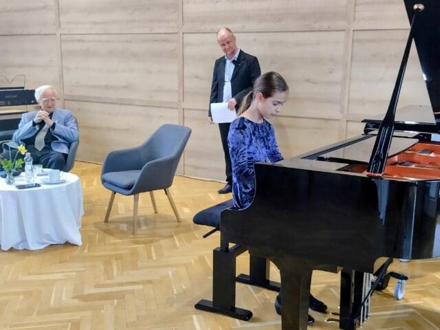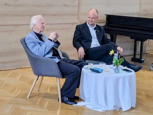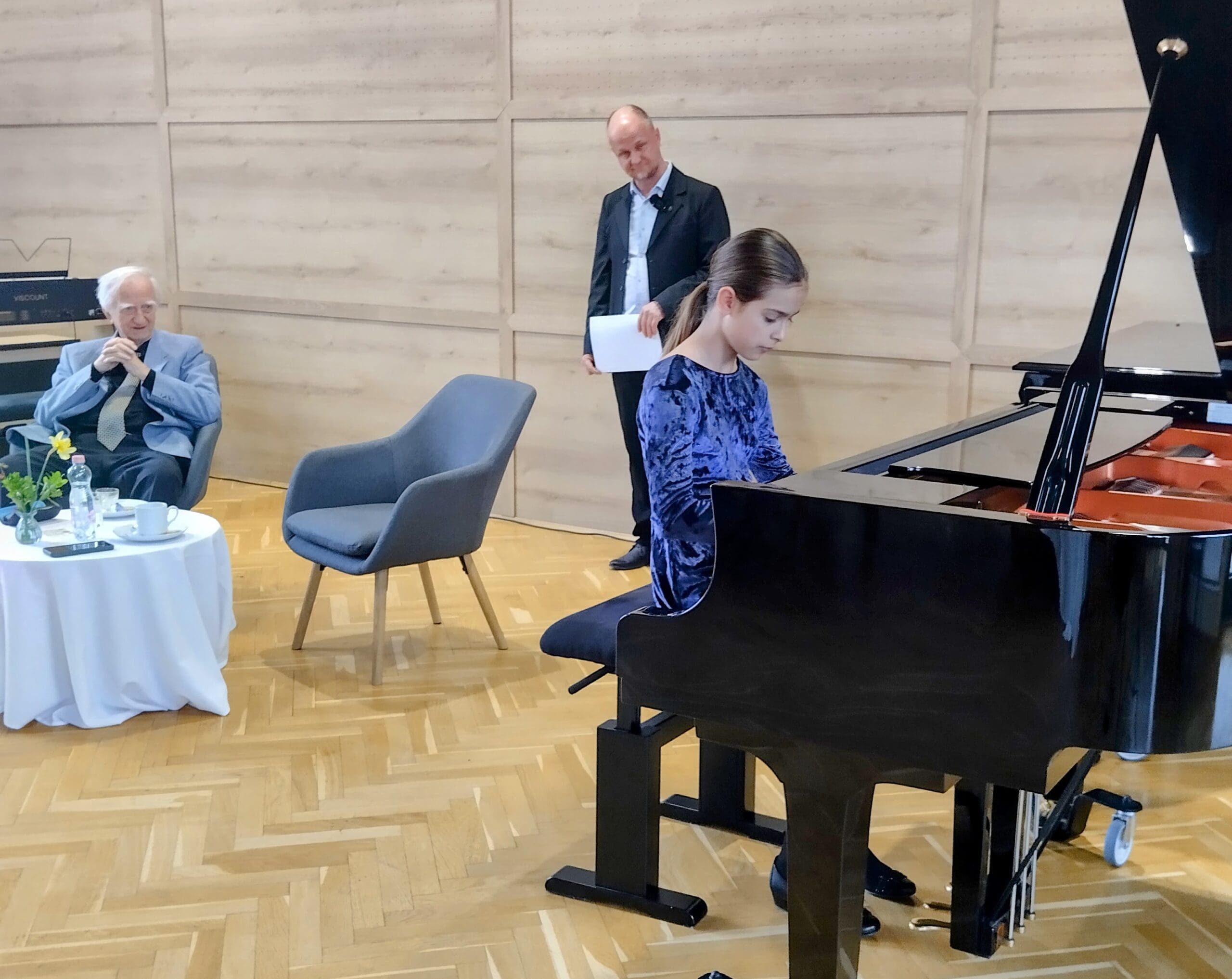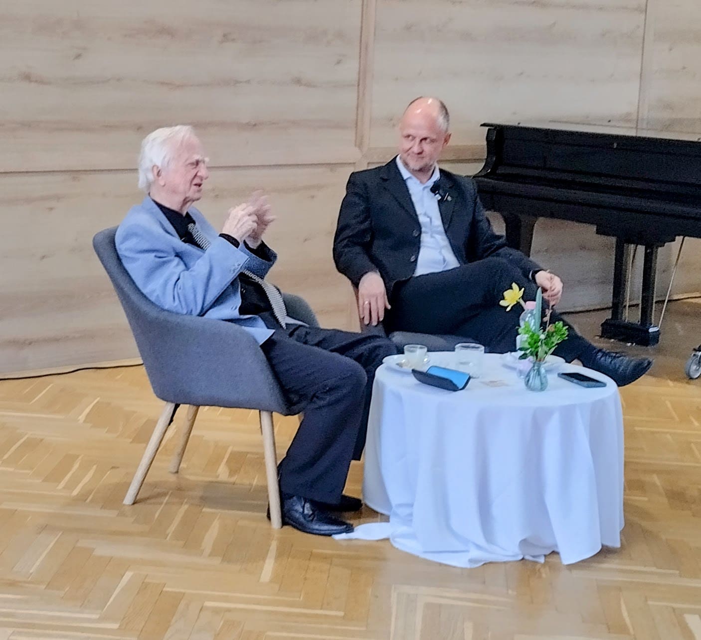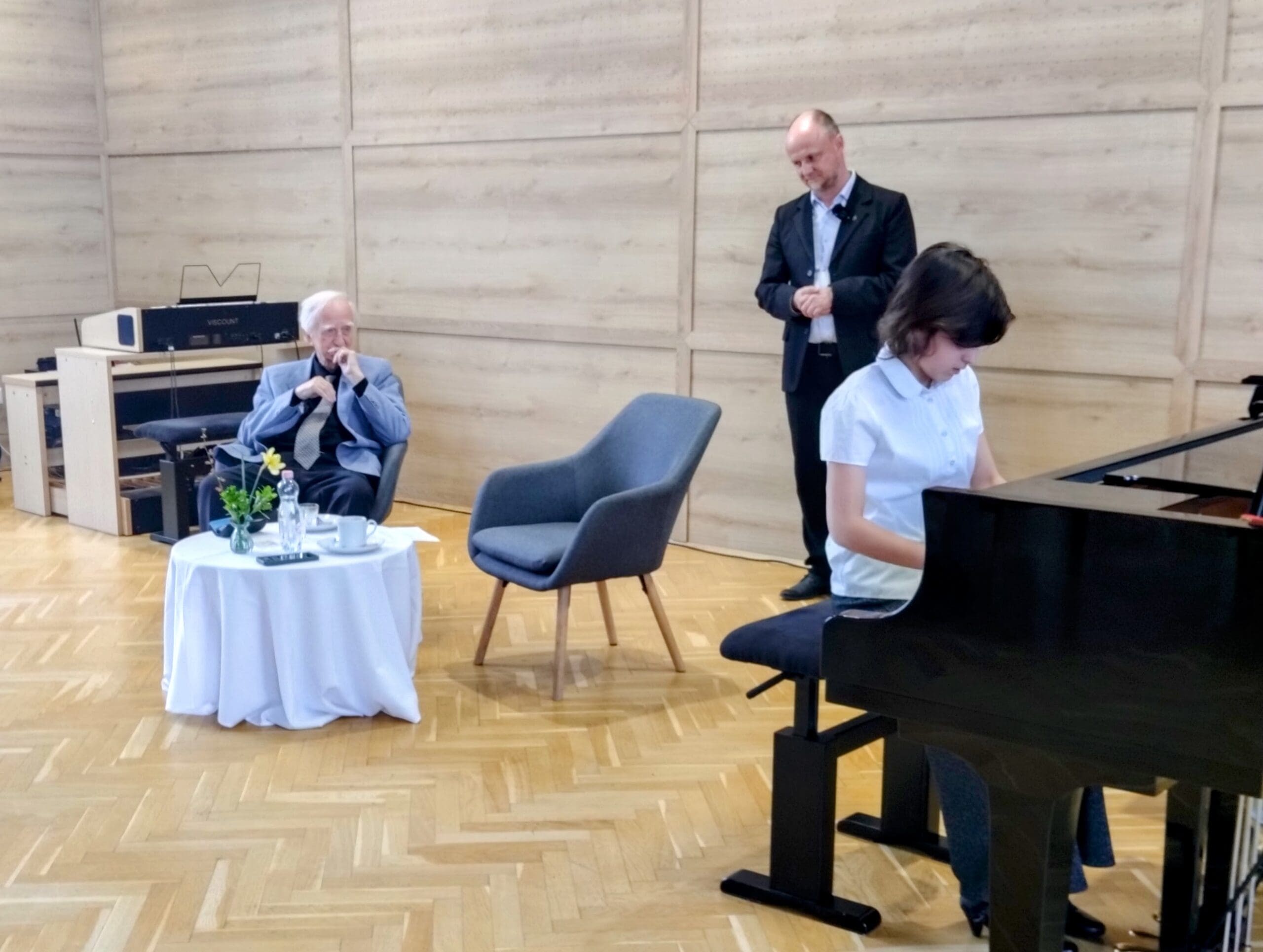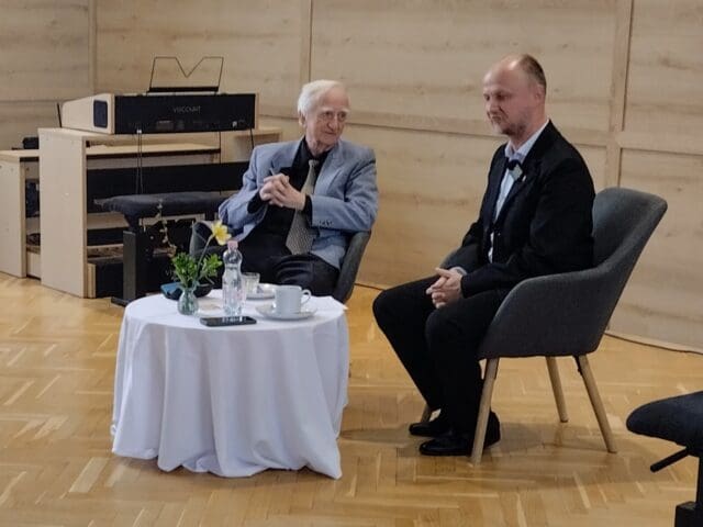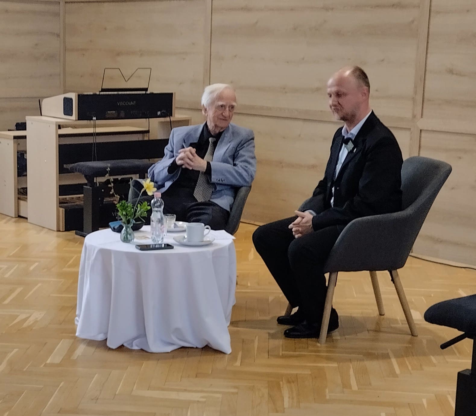 Balázs Árpád városunk díszpolgára, aki szívesen látogat Félegyházára, a mostani beszélgetést is örömmel vállalta. Beszélgetőtársa Kis-Fekete Vilmos karmester-igazgató volt. Balázs Árpád nosztalgiával idézte fel gyermekkora eseményeit, szentesi és félegyházi emlékeit, hiszen városunkhoz is ezer szállal kötődik. Mesélt kapcsolatáról az olyan „nagy öregekkel”, mint például Kodály Zoltán, akinek tankönyvében az akkor középiskolás Balázs Árpád műve is helyet kapott. Szívesen beszélt munkásságáról, kapcsolatáról a fúvós zenével. Felidézte az olyan kihívásokat is, amikor mindössze egyetlen éjszaka alatt kellett egy darab átiratát elkészítenie. Szó esett a hosszú évtizedekre visszanyúló baráti-szakmai kapcsolatáról Jankovszki Ferenccel, aki meghatározó szerepet töltött be városunk zenei életében. Az oly gazdag életmű néhány momentumára jutott csak idő az egy órás beszélgetésben, így derűsen ígérte meg Balázs Árpád, hogy újra eljön Félegyházára és mesél még munkásságáról.
