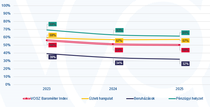 Ami a VOSZ Barométer 2025 negyedik negyedéves aktuális számait illeti, a fő mutató értéke 49 százalékra csökkent a harmadik negyedévi 50 százalékról, míg a legjobban teljesítő, a pénzügyi helyzetet tükröző alindex mutatója változatlan maradt (61 százalék). Hasonlóan stagnált az üzleti hangulatot tükröző alindex értéke is (58 százalék). A legalacsonyabb értéket mutató, a beruházási hajlandóságot mérő alindex pedig jelentősen csökkent, 28 százalékra esett vissza a harmadik negyedévi 32 százalékról.