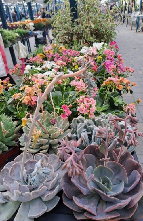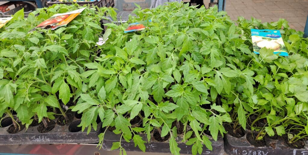 A spárga mellett palánták, tavaszi virágok sokasága a piacon