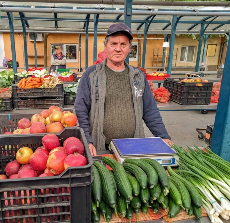 Antal Tibor termelő szabadföldi zöldhagymát, uborkát és almát kínált pénteken reggel. Elmondta, hogy a kerti munkák uborka-, paprika-, paradicsompalántázással folytatódnak. A fagyok sajnos tönkretették a sárgabarackot, az alma és szilva viszont szerencsésen túlélte a mínuszokat. A hagyma után körülbelül egy hónap múlva érkezik kínálatában az új burgonya.