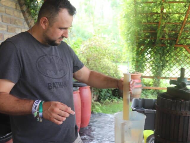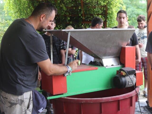 – Ennek a szüretnek az volt a lényege, hogy minden munkafolyamatot megismerjenek a gyerekek – vette át a szót Bodor Ádám. – A ládákat már előre kihordtuk abba a két sorba, amit le kellett szedni. Zalagyöngye szőlőt választottunk, aminek a termése könnyen leválasztható a vesszőről, mert nem késsel és nem is ollóval, hanem kézzel szedték le a fürtöket a diákok. A ládákat a fiúk felpakolták egy kiskocsira, azzal húztuk ki a sorok végére. Utána kistraktorra tették fel és azzal szállítottuk el a feldolgozás helyszínére, amit zúzás-bogyózás után kipréseltünk. A munkafolyamatot, a zúzó-bogyózó munkáját előtte természetesen elmondtam és meg is mutattam nekik. Préselés után a mustot megfokoltuk – huszonhárom fokos volt – természetesen megkóstoltuk, majd elmondtam a borkészítés további lépéseit is – számolt be a házigazda.