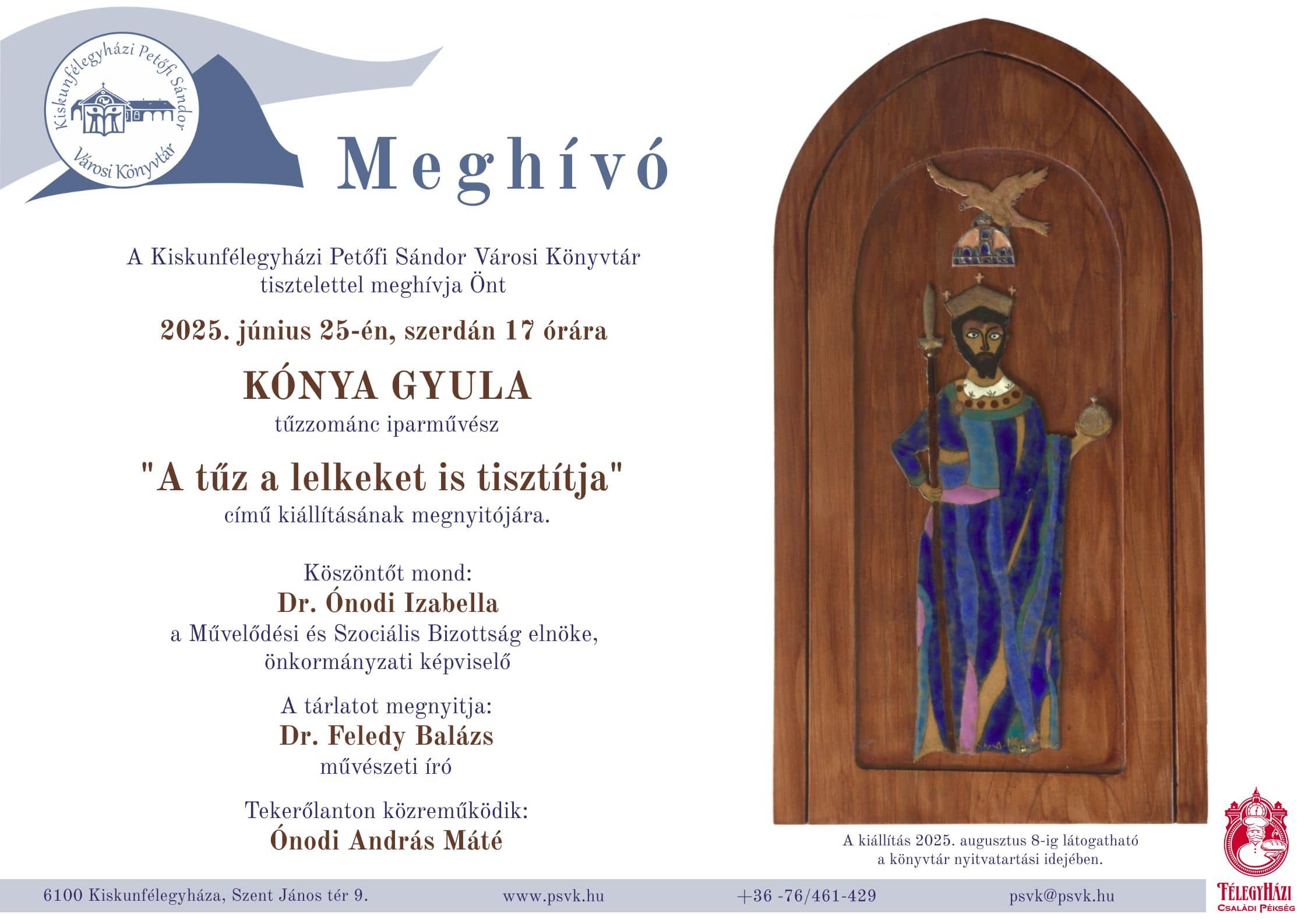Kónya Gyula tűzzománc iparművész A tűz a lelkeket is tisztítja című kiállítását június 25-én 17 órakor, a Kiskunfélegyházi Petőfi Sándor Városi Könyvtárban nyitják meg. Az eseményen dr. Feledy Balázs művészeti író mond köszöntőt, aki szakmai mélységgel és érzékenységgel vezeti be a közönséget Kónya Gyula különleges világába. A művész tűzzománc alkotásai a hő és a lélek kapcsolatát idézik meg: mindazt, amit a forma, az anyag és az érzelem együtt képesek közvetíteni.