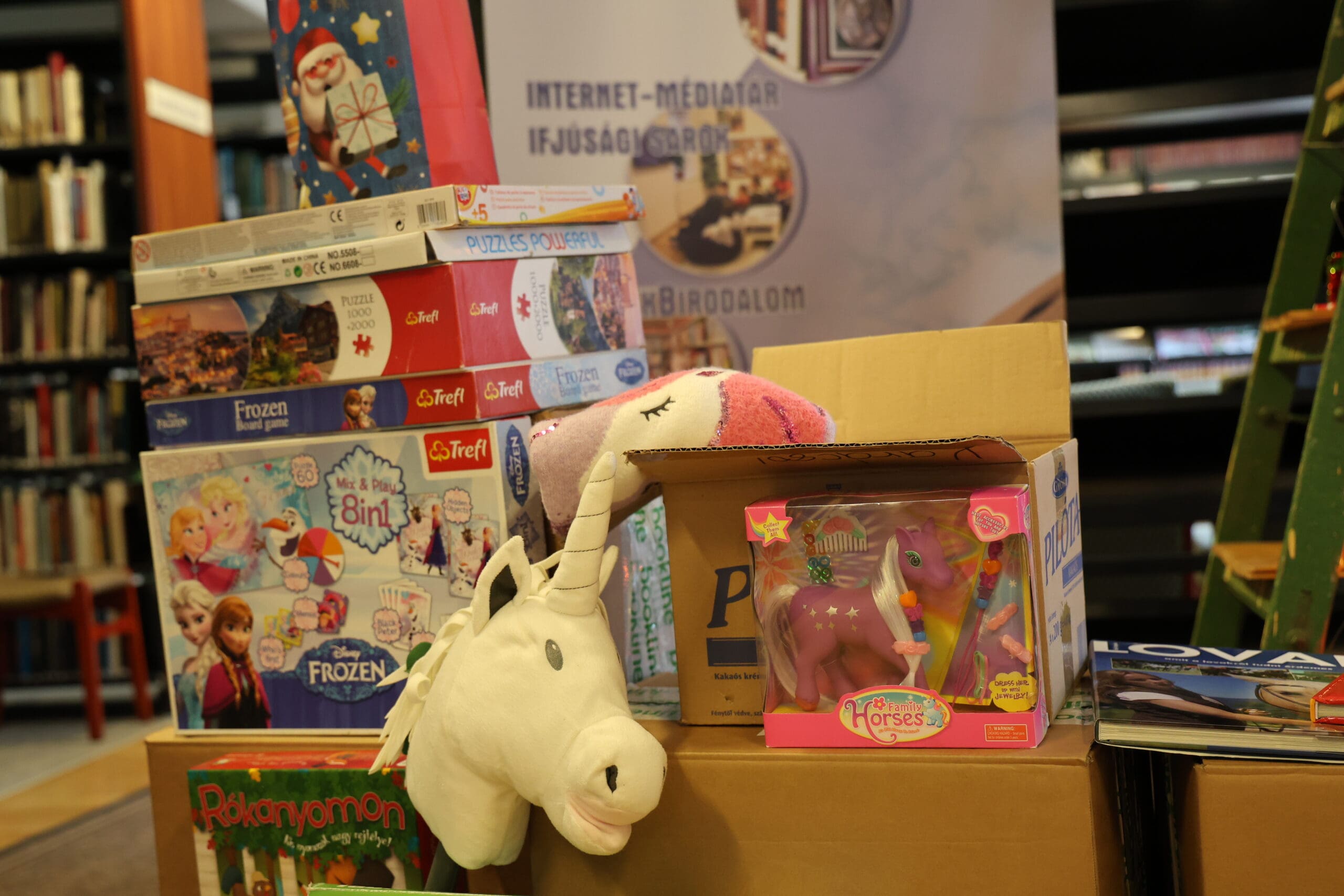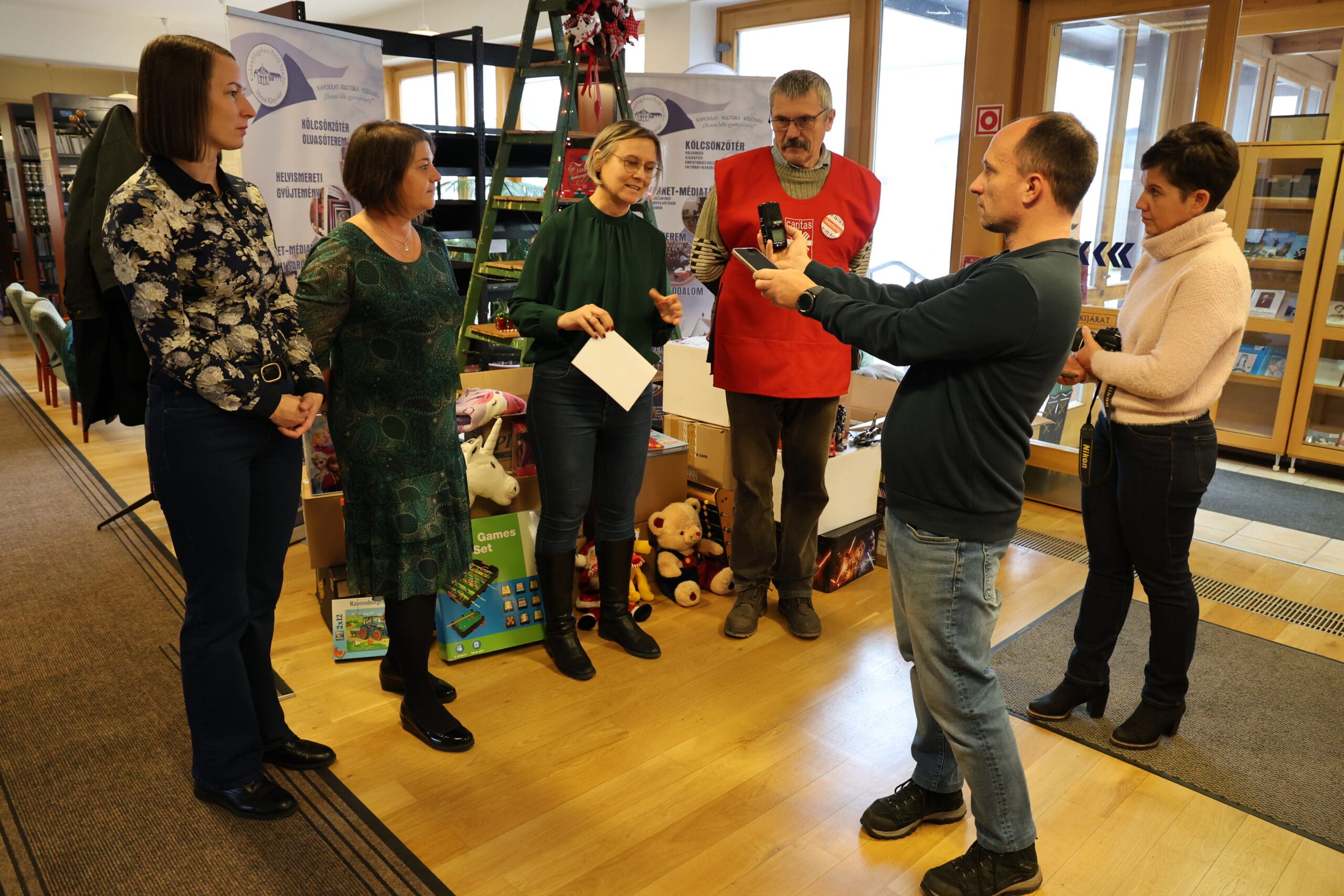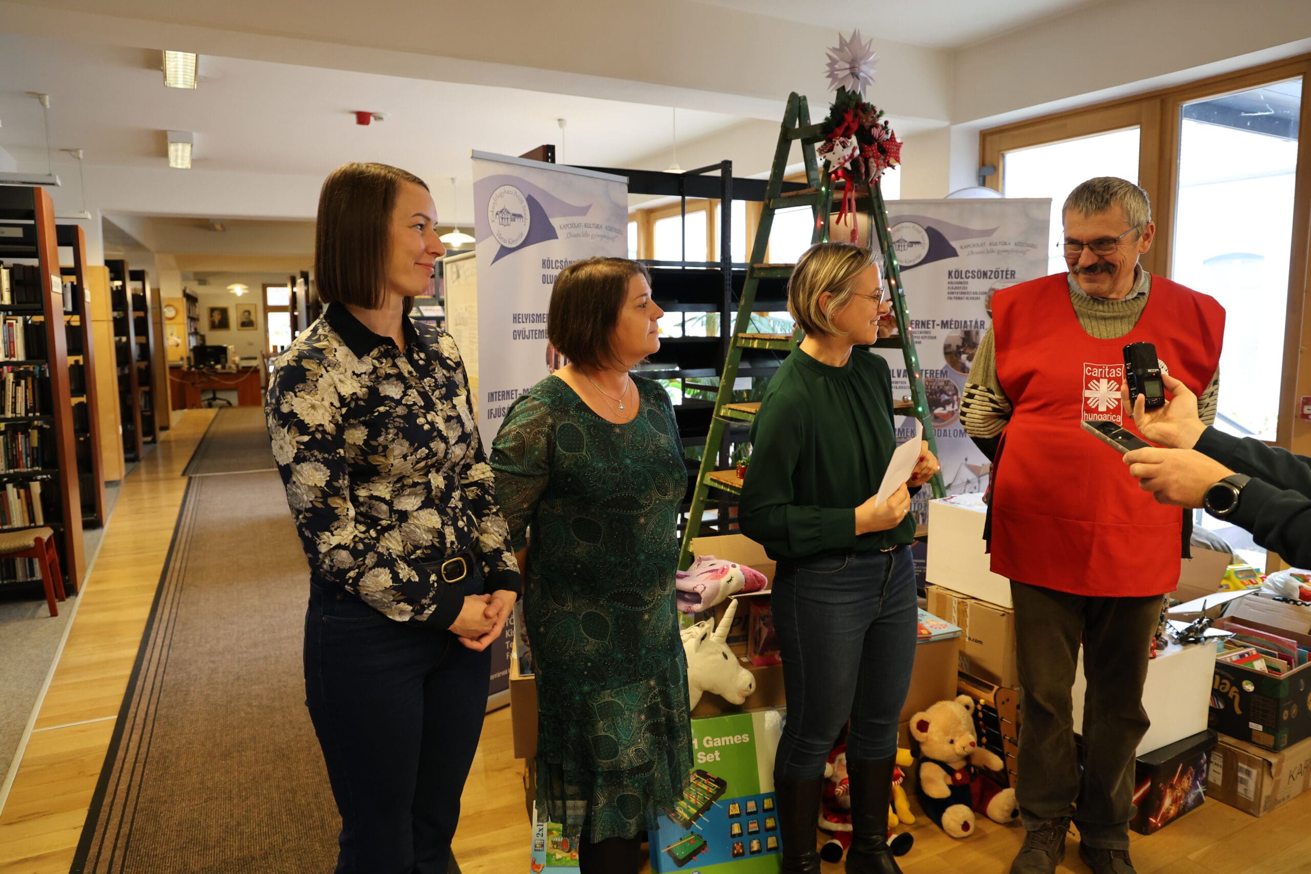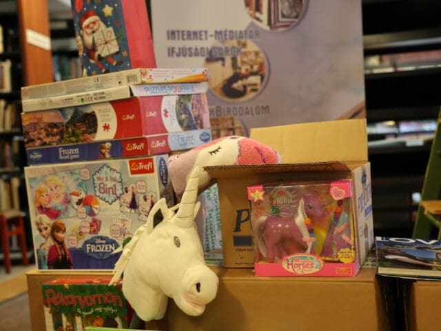 A könyvtár 2009 óta minden évben megszervezi karácsonyi adománygyűjtését, amihez idén is sokan csatlakoztak. Az átmeneti otthon kérése szerint most főként kreatív eszközöket gyűjtöttek, így rengeteg gyurma, festék, színes ceruza, kréta, kifestő és gyöngyfűző szett érkezett. A felajánlók azonban számos más kedvességgel is meglepték a gyerekeket: plüssmacikkal, kirakókkal, társasjátékokkal, kisautókkal, repülőkkel, ruhácskákkal, sőt még egy kis asztali csocsó is helyet kapott az adományok között. A Dél-100 Kft. is hozzájárult az adományokhoz.