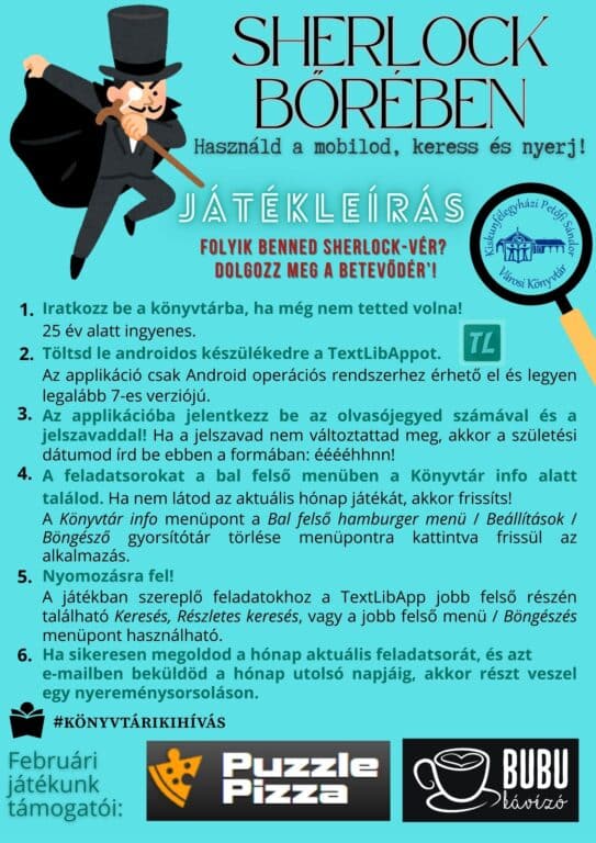 A nyereményekhez folyamatosan partnereket keresünk. A február végi sorsoláshoz a Puzzle Pizza öt pizzát ajánlott fel, míg a Bubu Kávézó egy ötezer forintos utalvánnyal járult hozzá. Májusig minden hónapban újabb izgalmas feladványokkal várjuk majd a Sherlock bőrébe bújó játékosokat, ezzel is ösztönözve az olvasás és a digitális könyvtárhasználat iránti érdeklődést.