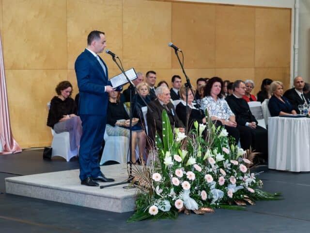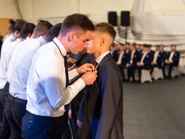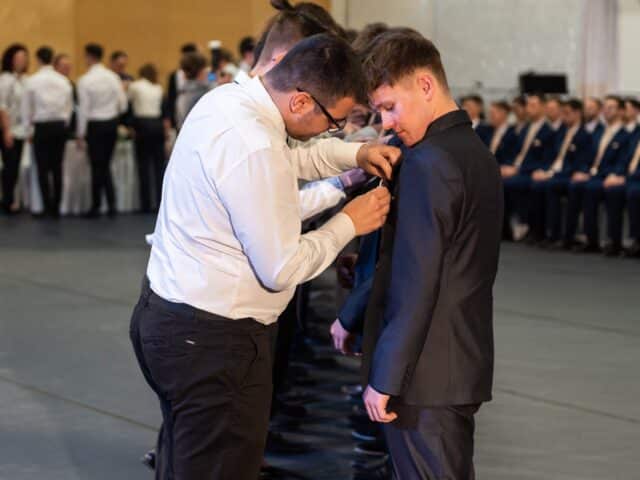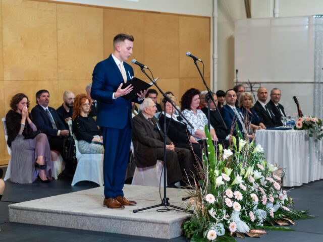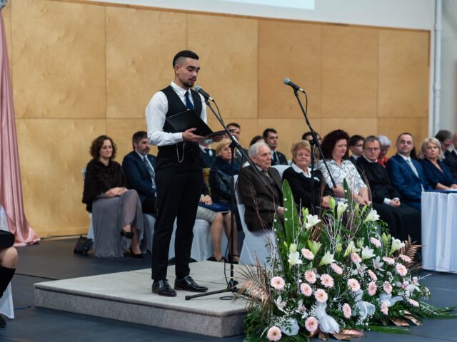 A szalagtűzés után Papp Nándor, 13. D osztályos diák, osztotta meg gondolatait. – Fontos ez a nap, hiszen ilyenkor nemcsak mi, hanem mindenki díszbe öltözik. – Beszédében felidézte az iskolában töltött időszakot, a legboldogabb pillanatokat, de szót ejtett a tanulással járó kihívásokról is. Jótanácsokat osztott meg az alsóbb évfolyamosokkal, és megköszönte a szülőknek az elmúlt évek támogatását.