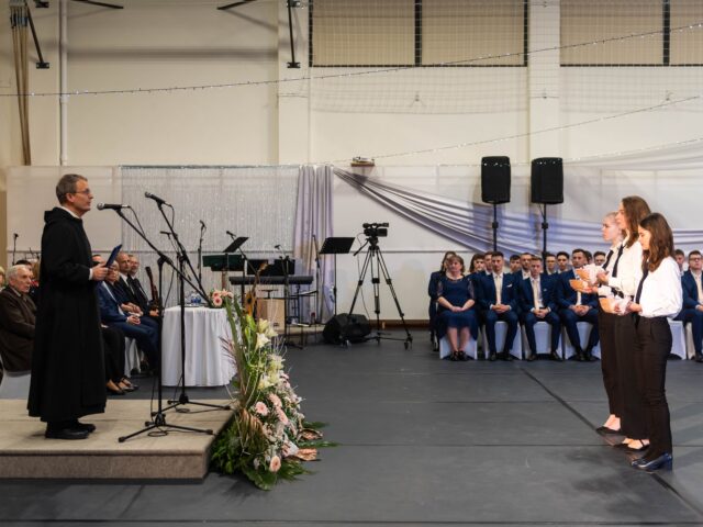 A folytatásban Titusz atya áldotta meg a végzős diákok szalagjait. Az áldást követően feltűzték a szalagokat a diákok ingjére, miközben az osztályfőnököktől a ballagó diákoknak címzett zeneszámok csendültek fel.