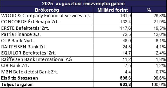A befektetési szolgáltatók rangsorában augusztusban is a WOOD & Company végzett az első helyen, 161,9 milliárd forintos forgalommal. Őt követte a Concorde 132,4 milliárddal, míg az ERSTE a harmadik helyet szerezte meg 117,6 milliárd forintos teljesítménnyel.