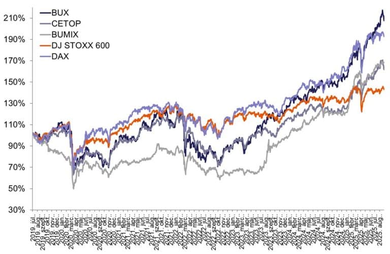 A BUX index augusztusban is folytatta emelkedő pályáját. A vezető részvénymutató több alkalommal is napi rekordot döntött, legmagasabb záróértékét augusztus 19-én, 106 542,7 ponton érte el. A hónap végére a BUX 1,3 százalékos növekedéssel 102 554,6 ponton fejezte be a kereskedést, ami a havi záróértékek között is új történelmi csúcsot jelent. A pozitív trend a BÉT további indexein is megfigyelhető volt, a CETOP NTR 2 158,7 ponton, az XTEND index pedig 1 903,6 ponton zárta az augusztust.