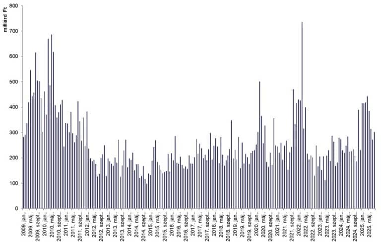 Az azonnali részvénypiac havi forgalma 301,9 milliárd forint volt, amely napi átlagban 15,1 milliárd forintot tett ki.
