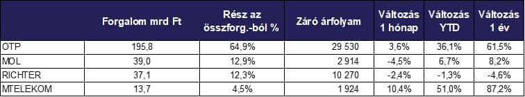A legnagyobb forgalom továbbra is az OTP Bankhoz kötődött, a bank papírjaival 195,8 milliárd forint értékben kereskedtek a hónap során. A második helyen a MOL végzett 39 milliárddal, míg a Richter Gedeon részvényei 37,1 milliárdos forgalmat értek el. A kis- és közepes kapitalizációjú vállalatok között az ÉPDUFERR Nyrt. és a Glia Nova Nyrt. teljesítettek kiemelkedően, előbbi részvényeinek árfolyama 143,9 százalékkal, utóbbié 71,7 százalékkal emelkedett augusztusban.