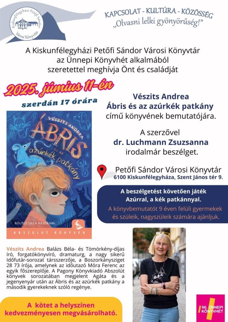 Vészits Andrea író, forgatókönyvíró, dramaturg legújabb, Ábris és az azúrkék patkány című gyerekkönyvét június 11-én, szerdán 17 órakor mutatják be a Kiskunfélegyházi Petőfi Sándor Városi Könyvtárban. Az Ünnepi Könyvhét programsorozat részeként megrendezett eseményre szeretettel várják az olvasni szerető gyerekeket és családjaikat. A bemutatót elsősorban 9 évesnél idősebb gyermekeknek, valamint szülőknek, nagyszülőknek, pedagógusoknak ajánlják. A könyv a helyszínen kedvezményesen megvásárolható.