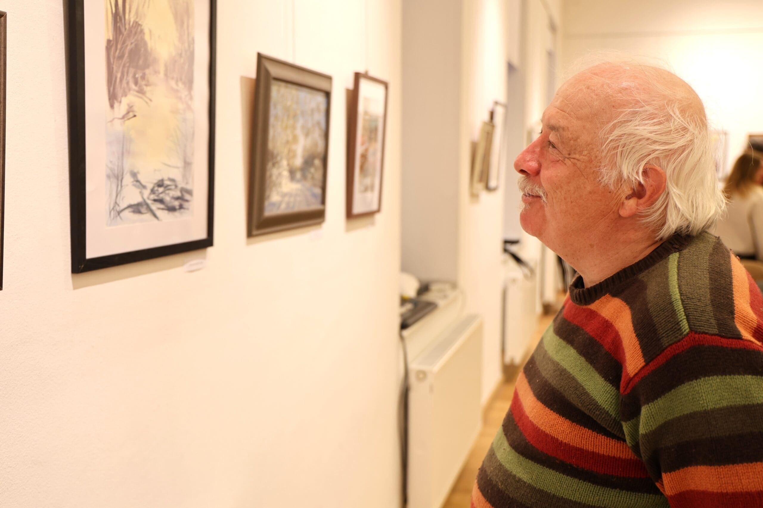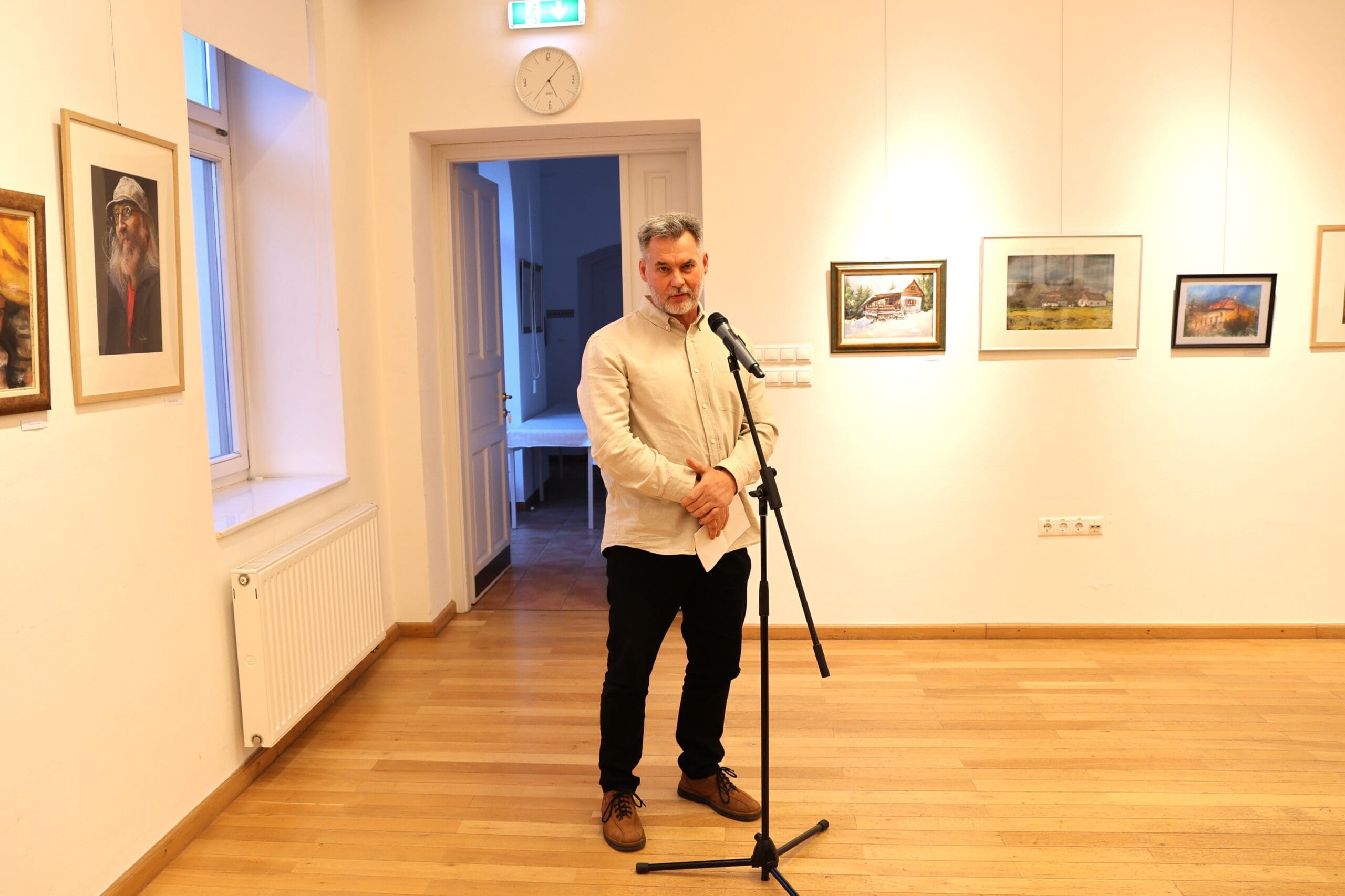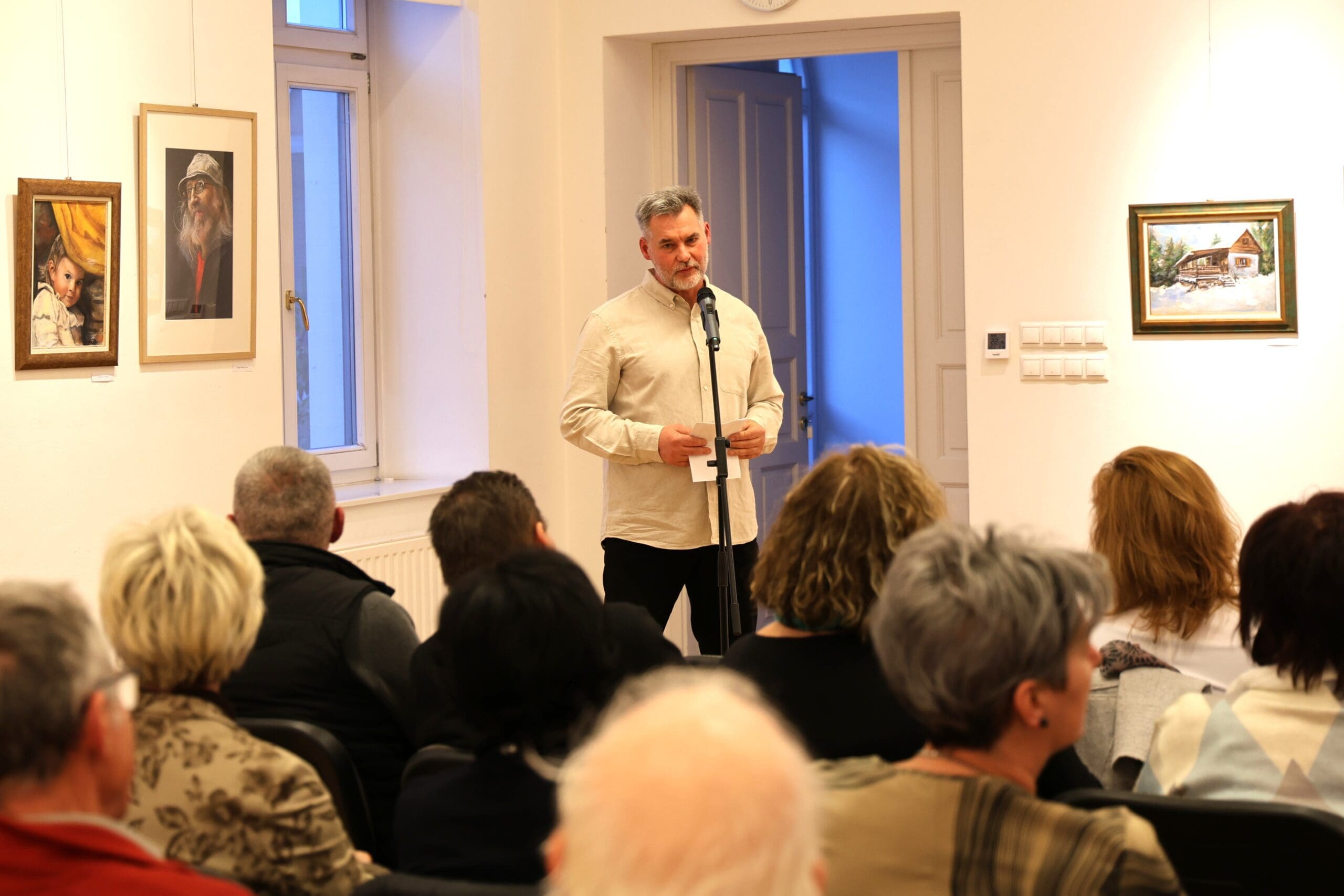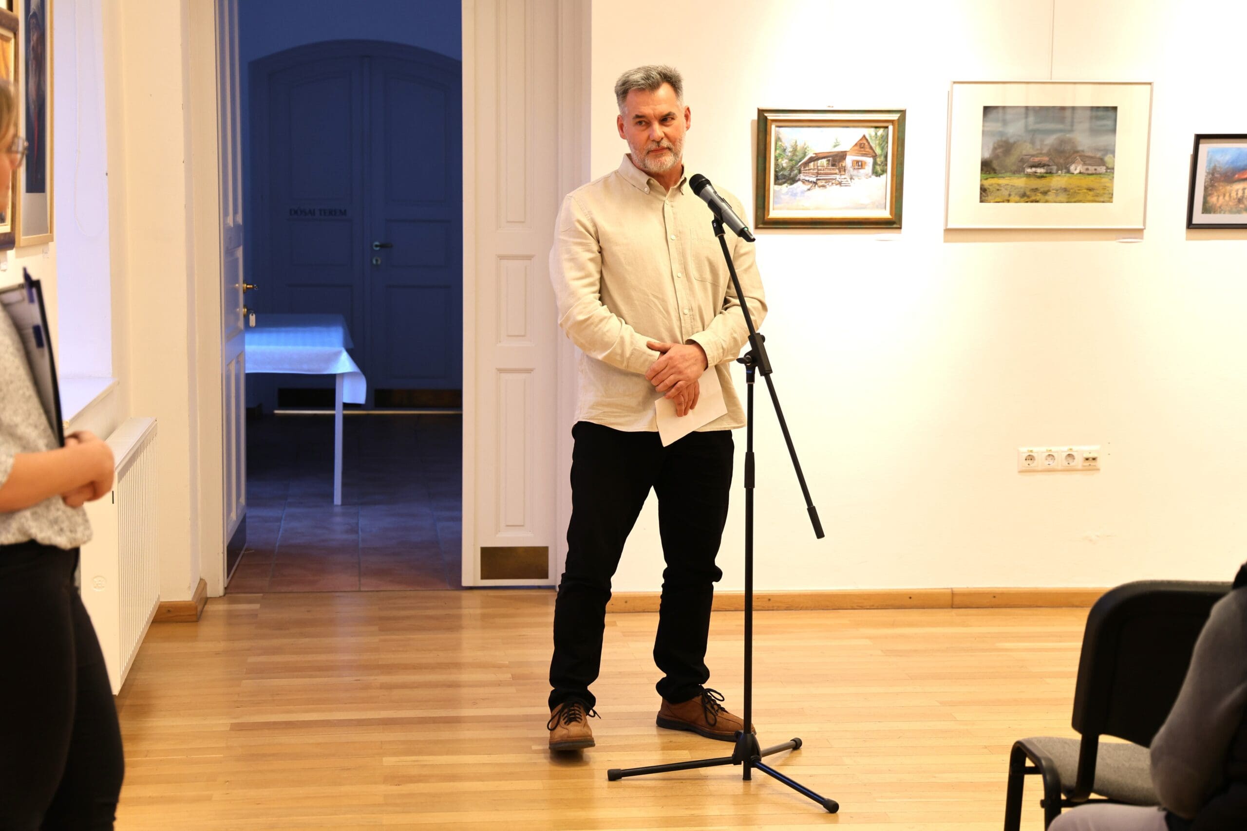 – A jelenleg kiállított képek 10 alkotó keze nyomát viselik, pasztell, paverpol, olaj, akril és akvarell technikával készültek. A szakkörnek az egyik legfontosabb mondanivalója, küldetése, hogy az ember megérkezik oda, leteszi a gondjait és belemerítkezik abba, amit csinál. Ha ezt nem teszi, akkor nem tud alkotni. Muszáj levetkőznünk ilyenkor a hétköznapok gondjait, bajait, a problémáit és utána azt vesszük észre, hogy – bár lehet, hogy rossz kedvűen érkeztem – mégis feltöltődve megyek haza. A közös érdeklődési körnek véleményem szerint az a feladata, hogy az embert egy kicsit kiszakítsa a hétköznapokból. A magunk példájából is tudom mondani, hogy nehezen jutunk el sokszor egy foglalkozásra, utána viszont azt érzi mindenki, hogy kár lett volna kihagyni. Ha egy alkotásnak vége, bekeretezik a képet, végső helyére kerül, akkor jól is érezzük magunkat és a nézőknek is adtunk valamit. Nekünk ezzel a kiállítással az volt a célunk, hogy adjunk a közönségnek, egymásnak és magunknak: egy emléket, egy képzeletbeli dolgot... Ha ez megtörténik, akkor ez jó dolog és erre törekedni kell – fogalmazott a mester, majd bemutatta az alkotóműhely tagjait, kiemelve személyes történeteiket, ismertetve technikájuk és stílusuk egyediségét.
