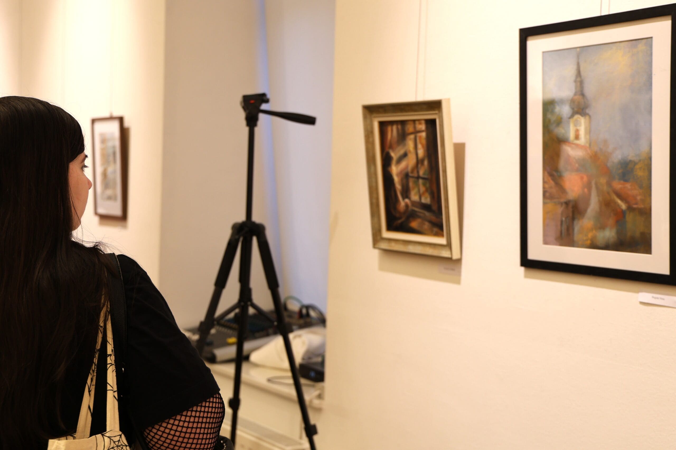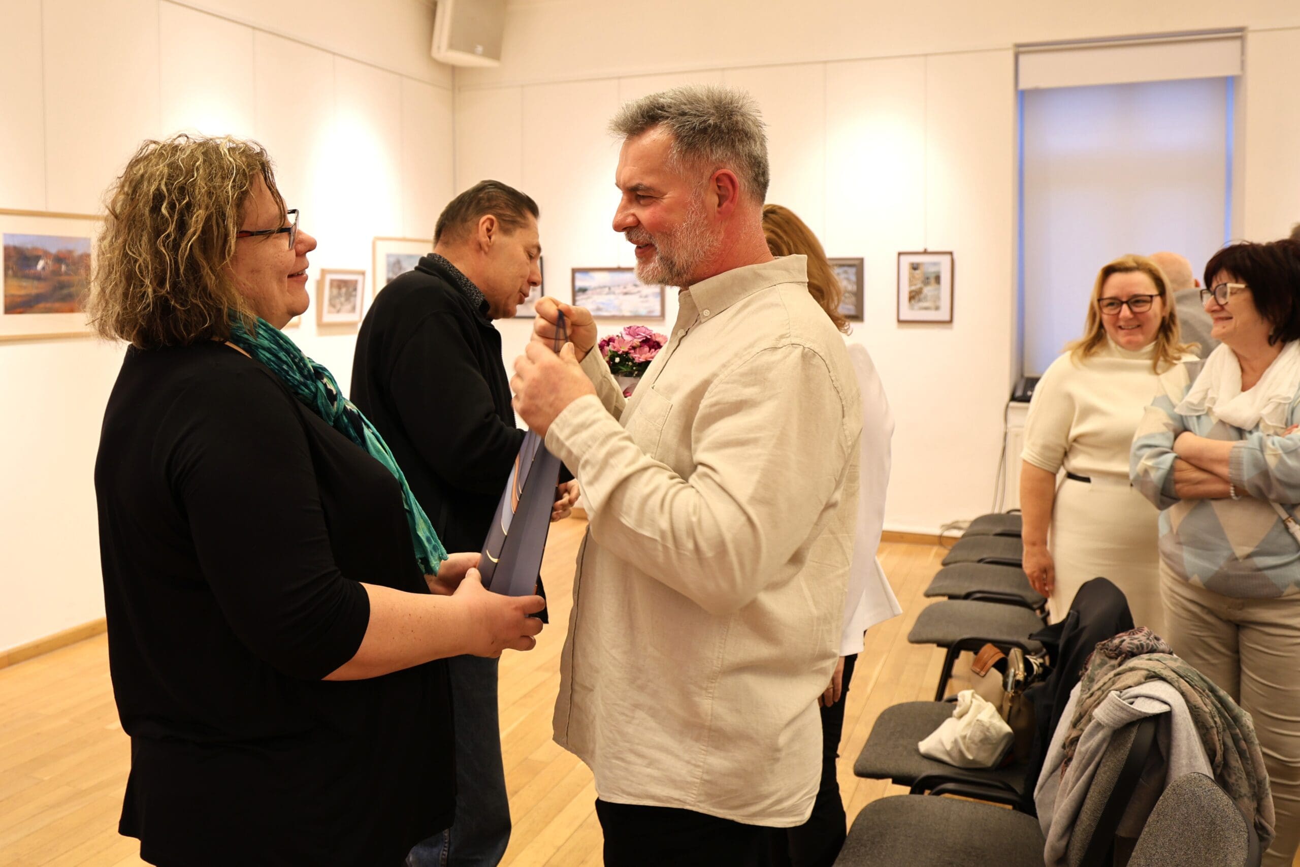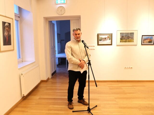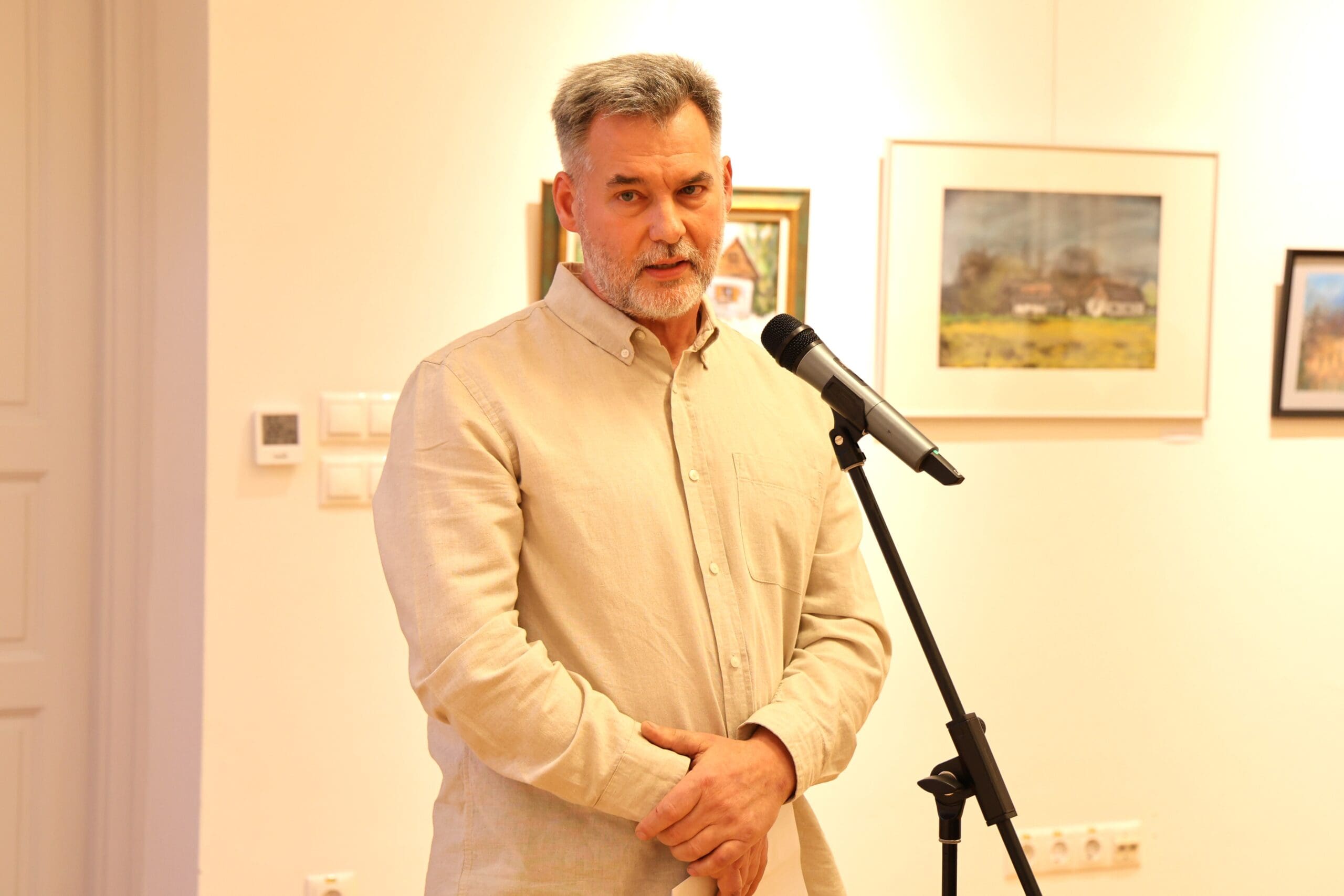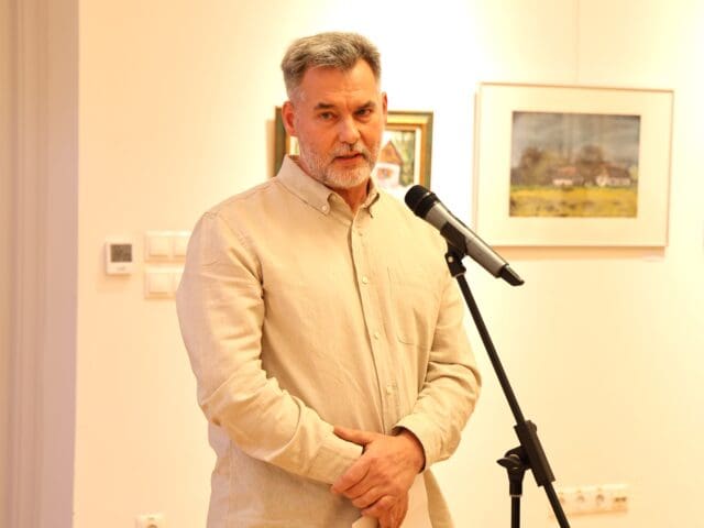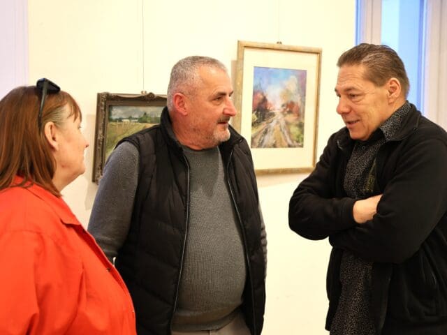 – A jelenleg kiállított képek 10 alkotó keze nyomát viselik, pasztell, paverpol, olaj, akril és akvarell technikával készültek. A szakkörnek az egyik legfontosabb mondanivalója, küldetése, hogy az ember megérkezik oda, leteszi a gondjait és belemerítkezik abba, amit csinál. Ha ezt nem teszi, akkor nem tud alkotni. Muszáj levetkőznünk ilyenkor a hétköznapok gondjait, bajait, a problémáit és utána azt vesszük észre, hogy – bár lehet, hogy rossz kedvűen érkeztem – mégis feltöltődve megyek haza. A közös érdeklődési körnek véleményem szerint az a feladata, hogy az embert egy kicsit kiszakítsa a hétköznapokból. A magunk példájából is tudom mondani, hogy nehezen jutunk el sokszor egy foglalkozásra, utána viszont azt érzi mindenki, hogy kár lett volna kihagyni. Ha egy alkotásnak vége, bekeretezik a képet, végső helyére kerül, akkor jól is érezzük magunkat és a nézőknek is adtunk valamit. Nekünk ezzel a kiállítással az volt a célunk, hogy adjunk a közönségnek, egymásnak és magunknak: egy emléket, egy képzeletbeli dolgot... Ha ez megtörténik, akkor ez jó dolog és erre törekedni kell – fogalmazott a mester, majd bemutatta az alkotóműhely tagjait, kiemelve személyes történeteiket, ismertetve technikájuk és stílusuk egyediségét.