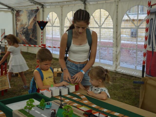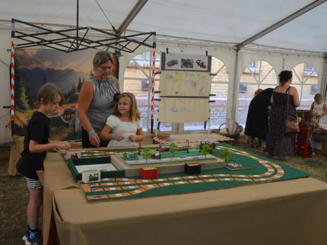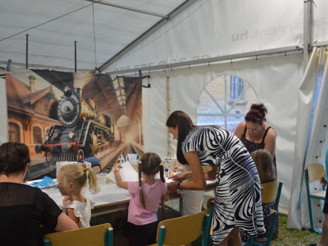 A kézműves sátorban igazi vasúti világ kelt életre: a belépéskor kapott jegyet az állomásokon matricával érvényesítették, majd csokoládéra lehetett beváltani. A váróteremben vasúttal kapcsolatos újságokat olvashattak a szülők, a babaterem pedig játékos vonatos szőnyeggel, színes mozdonyokkal és labdákkal várta a legkisebbeket. A nagy fa mozdonyba ülve bárki utassá, vagy mozdonyvezetővé válhatott. Emellett látványos terepasztal és ügyességi játékok, így például sorompóemelés és rakománypakolás is szórakoztatta a látogatókat. A kézműves foglalkozásokon pedig gipsz vonatfigurák, gyurmamozdonyok és papír terepasztalok készültek az apró kezek között.