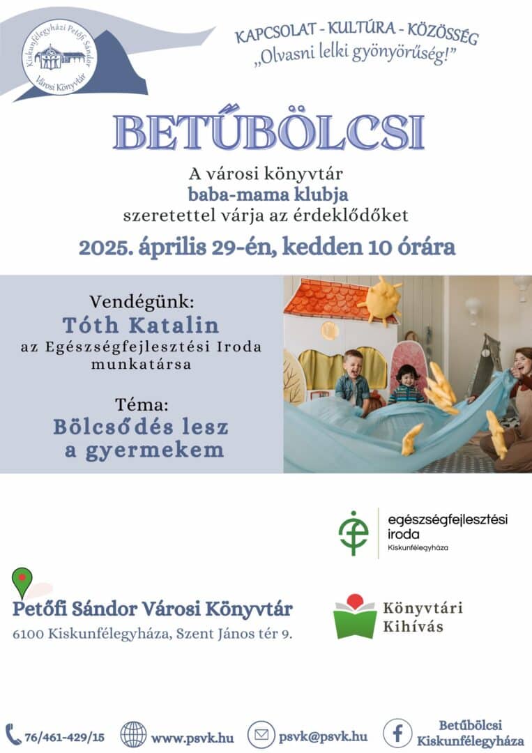 A kisgyermekes családok életében mérföldkő, amikor a legkisebbek bölcsődébe készülnek. Az ezzel járó örömök és kihívások számos kérdést vethetnek fel a szülőkben. Ezekre ad választ a Kiskunfélegyházi Petőfi Sándor Városi Könyvtár Betűbölcsi programjának következő vendége, Tóth Katalin, a Kiskunfélegyházi Egészségfejlesztési Iroda vezetője.