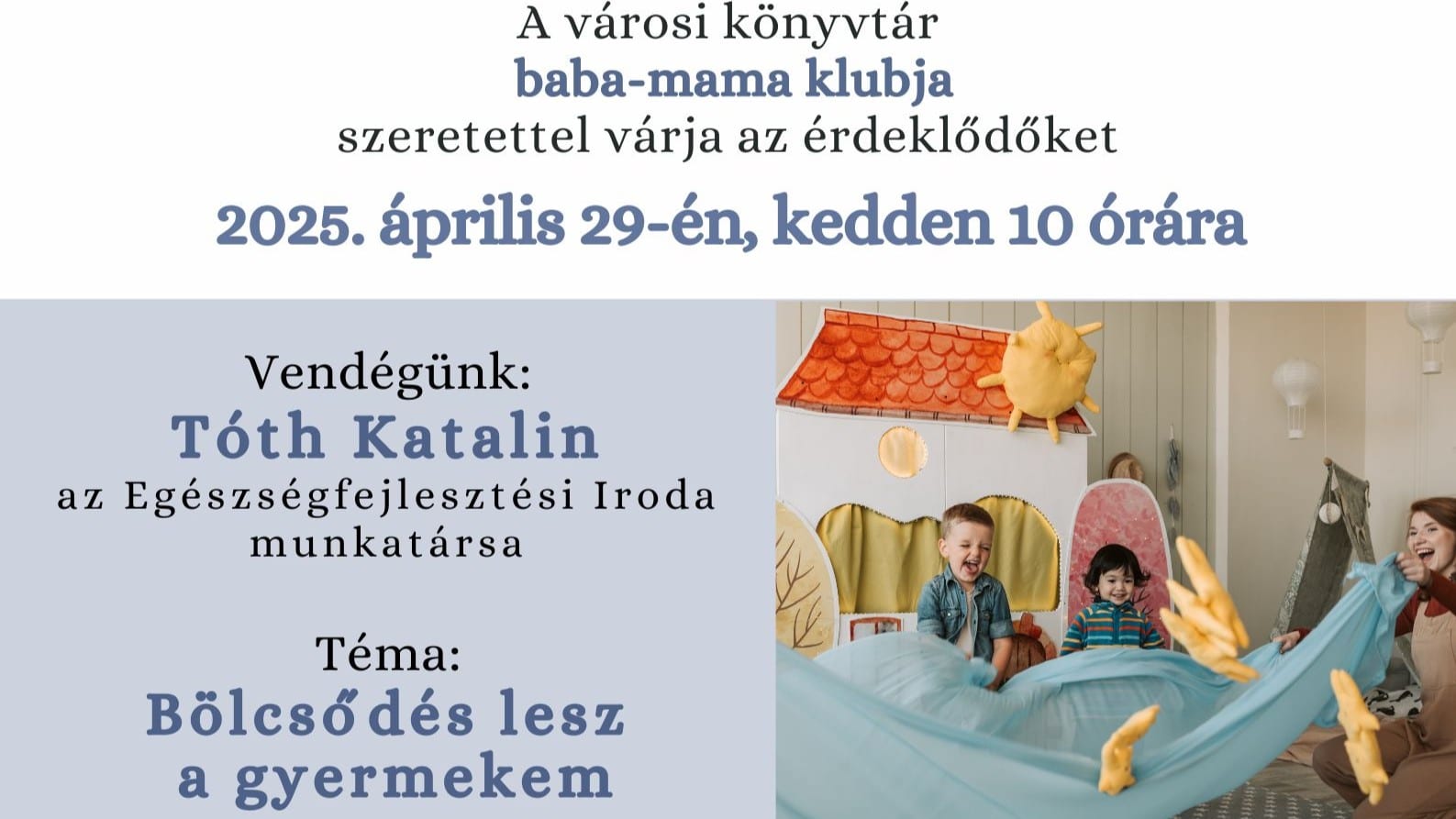 Április 29-én 10 órától várják az érdeklődő szülőket a Bölcsődés lesz a gyermekem című előadásra, ahol szó lesz az egészséges fejlődés támogatásáról, az új környezethez való alkalmazkodás megkönnyítéséről, a bölcsődei beszoktatás lelki oldaláról, valamint a mindennapi egészségmegőrzés lehetőségeiről is.