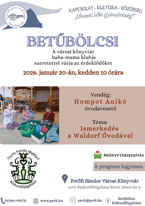 Jövő kedden ismét várja a családokat a Petőfi Sándor Városi Könyvtár baba-mama klubja, a Betűbölcsi, amely ezúttal különösen hasznos és aktuális témával készül az óvodaválasztás előtt állók számára. A január 20-án, kedden 10 órakor kezdődő programon a szülők kötetlen, barátságos környezetben ismerkedhetnek meg a Waldorf pedagógia szemléletével, miközben a legkisebbek is jól érezhetik magukat.