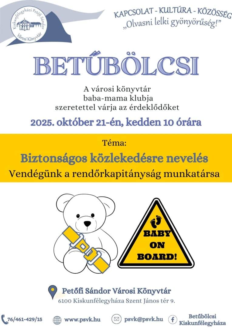 A biztonságos közlekedésre nevelés lesz a fókuszban a Kiskunfélegyházi Petőfi Sándor Városi Könyvtár Betűbölcsi programján október 21-én 10 órától. A baba-mama klub vendége a rendőrkapitányság munkatársa lesz, aki közérthetően mutatja be, hogyan alapozhatják meg a szülők már kisgyermekkorban a biztonságos közlekedés szokásait.