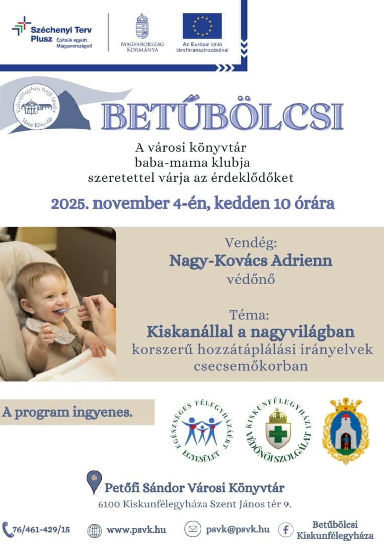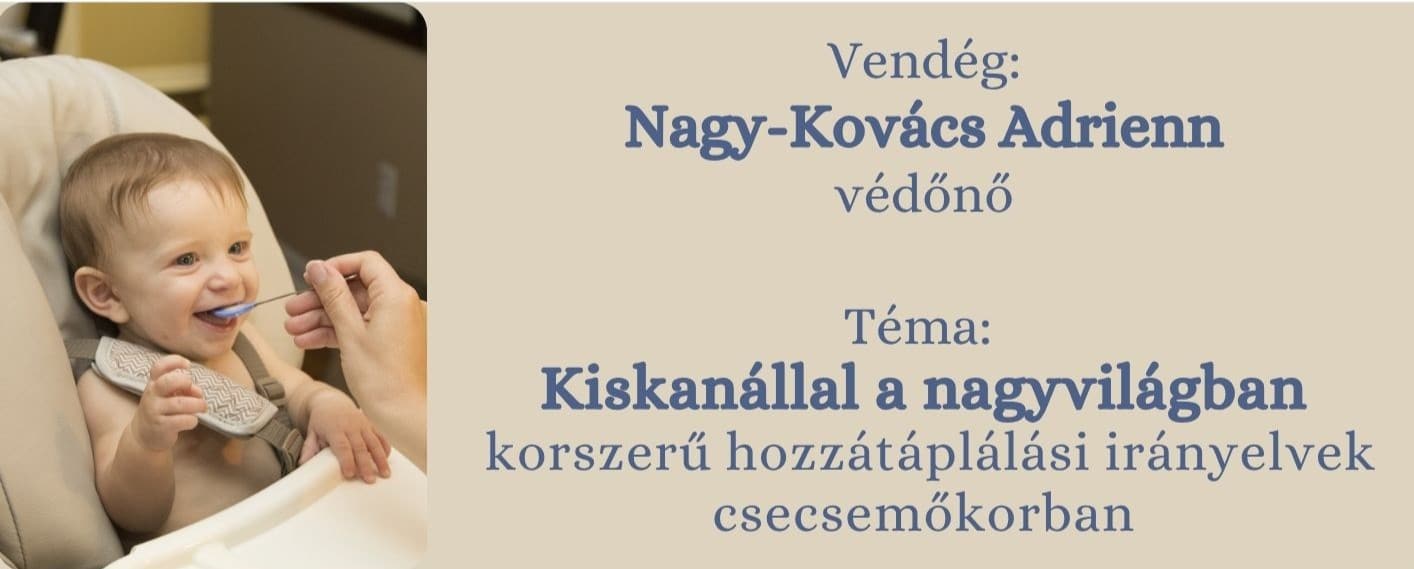 Vendégként Nagy-Kovács Adrienn védőnő érkezik, aki Kiskanállal a nagyvilágban – korszerű hozzátáplálási irányelvek csecsemőkorban címmel tart előadást. A résztvevők megismerhetik a legfrissebb táplálkozási ajánlásokat, gyakorlati tanácsokat kaphatnak a hozzátáplálás megkezdéséhez, és feltehetik saját kérdéseiket is.