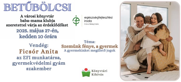 A szemünk fénye, a gyermek címmel Ficsór Anita, a Kiskunfélegyházi Egészségfejlesztési Iroda munkatársa és gyermekvédelmi gyám tart előadást a gyermekjogokról május 27-én, kedden 10 órai kezdettel a Kiskunfélegyházi Petőfi Sándor Városi Könyvtárban.