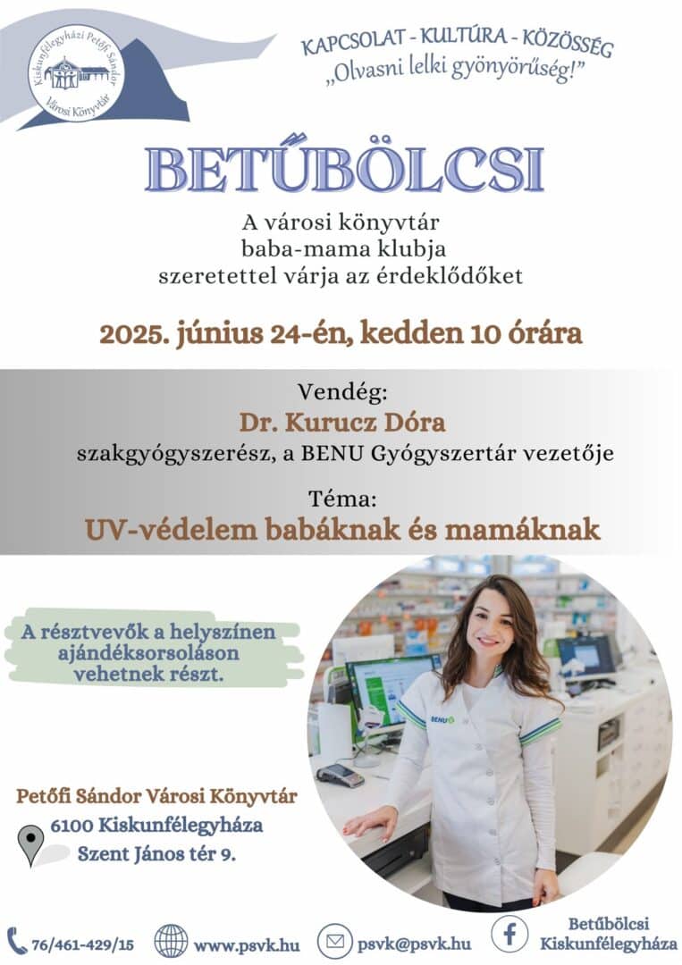 A legkisebbek biztonsága minden évszakban fontos, de nyáron különösen nagy figyelmet igényel a megfelelő fényvédelem. Június 24-én 10 órától újabb alkalommal folytatódik a Betűbölcsi, a Kiskunfélegyházi Petőfi Sándor Városi Könyvtár baba-mama klubja. Ezúttal a vendég dr. Kurucz Dóra szakgyógyszerész, a BENU Gyógyszertár vezetője, aki a babák és anyukák UV-védelmének fontosságáról beszél.
