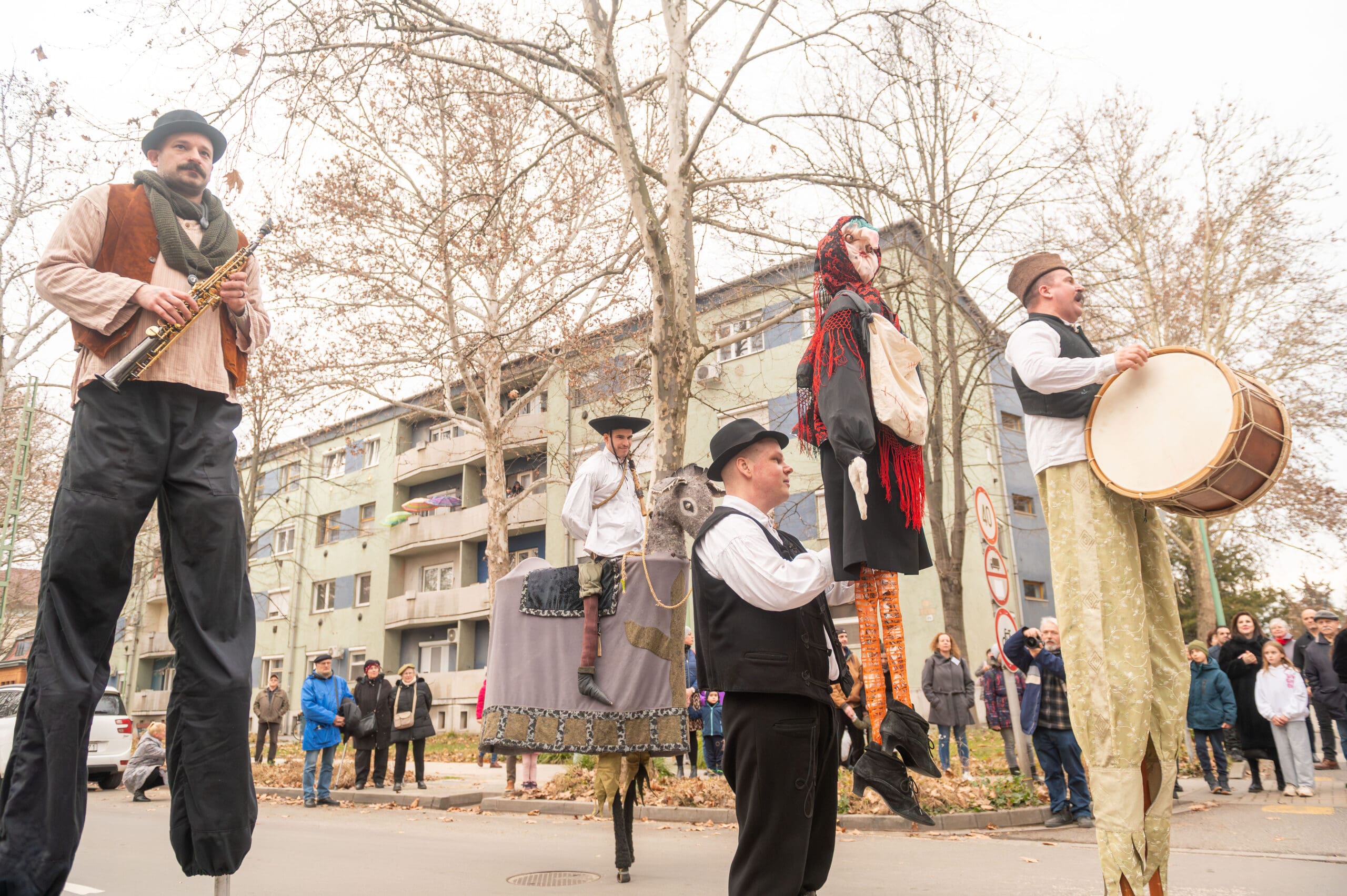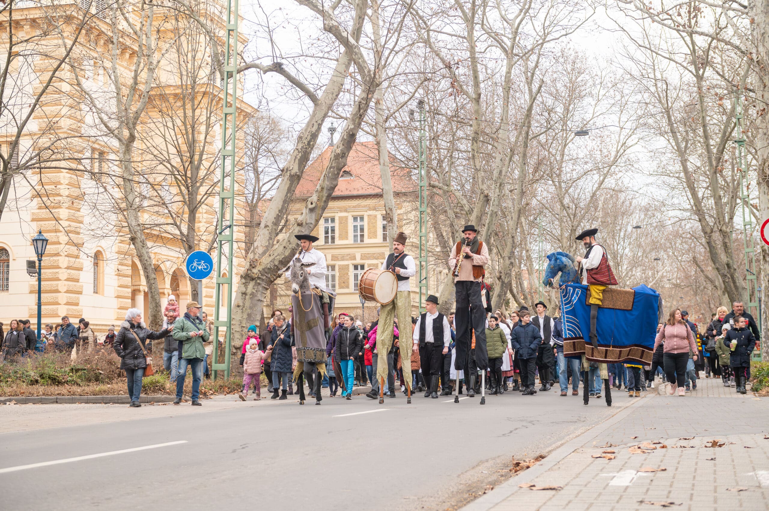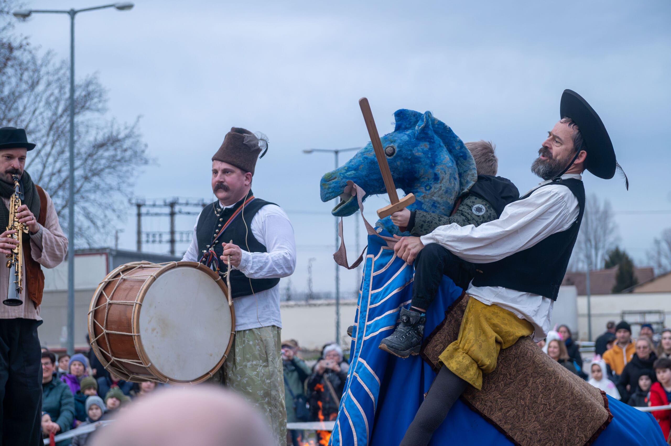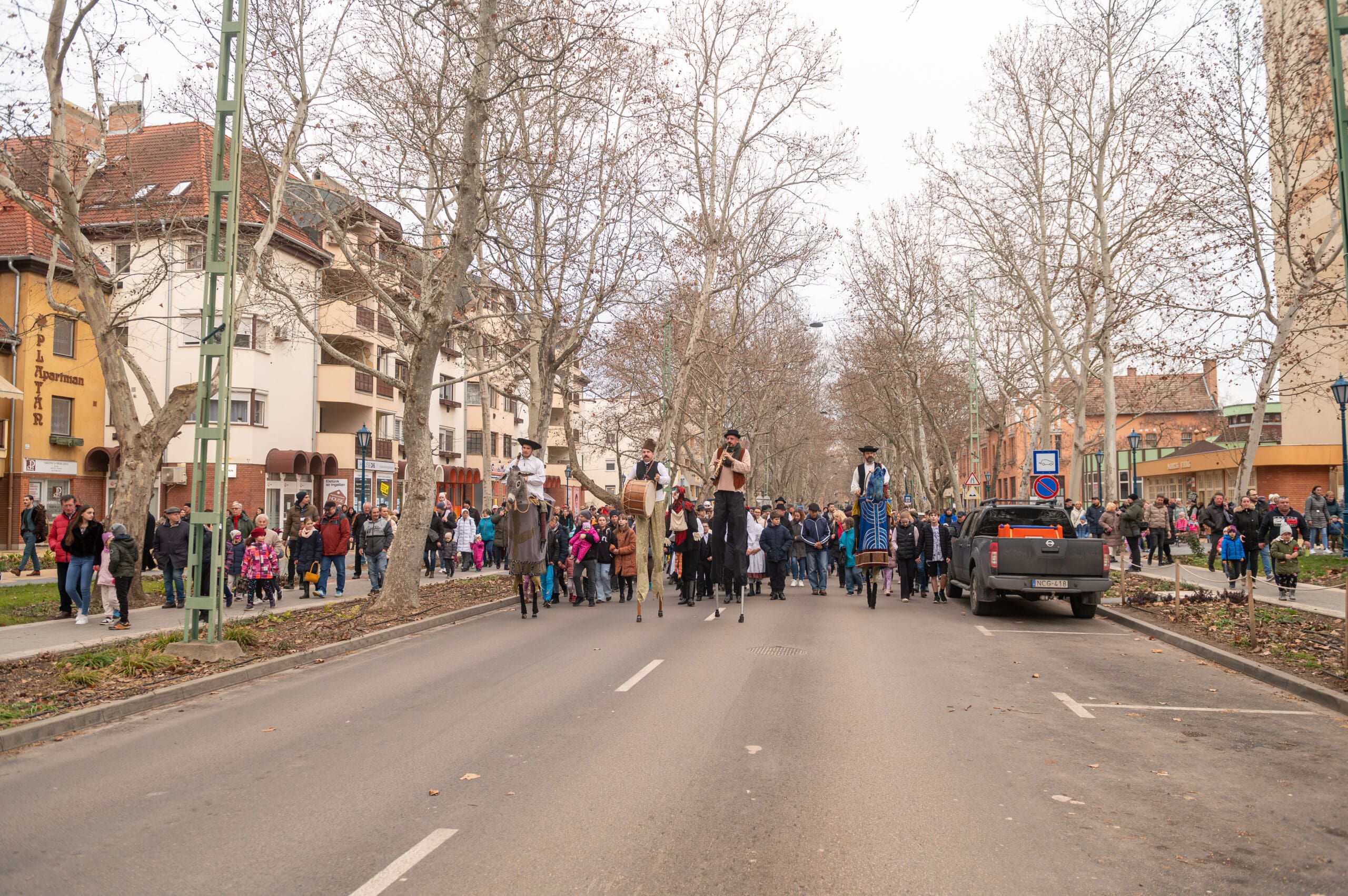 A sokszínű menetet idén is a város szelíd óriásai, a Langaléta Garabonciások vezették végig a Kossuth utcán zenebona és tánc kíséretében. A felvonulás végül a Városi Sportcsarnokhoz érkezett, ahol már lobogott az égő máglya.