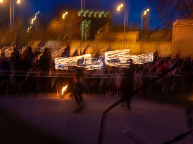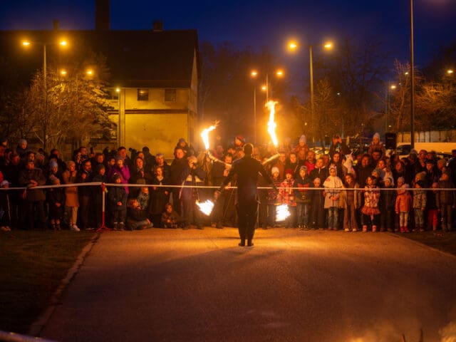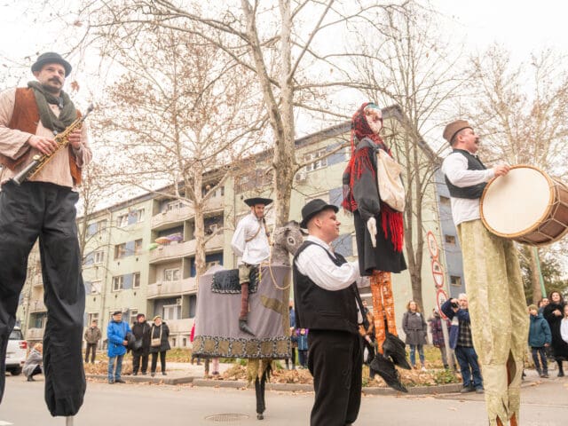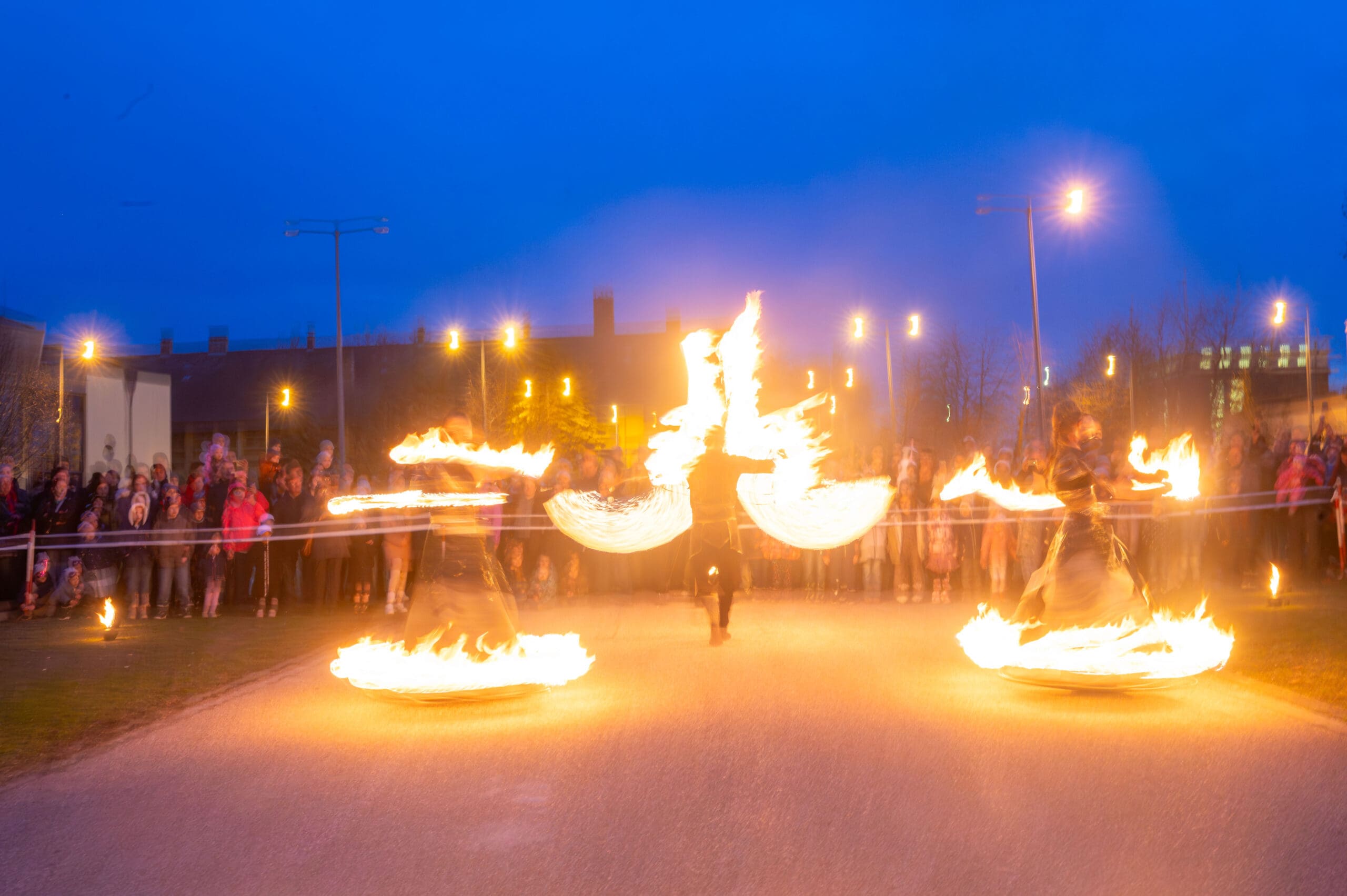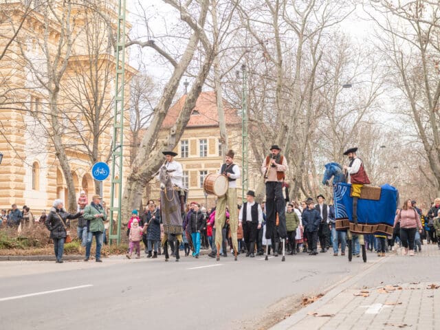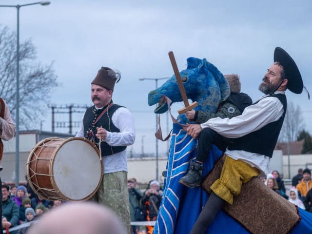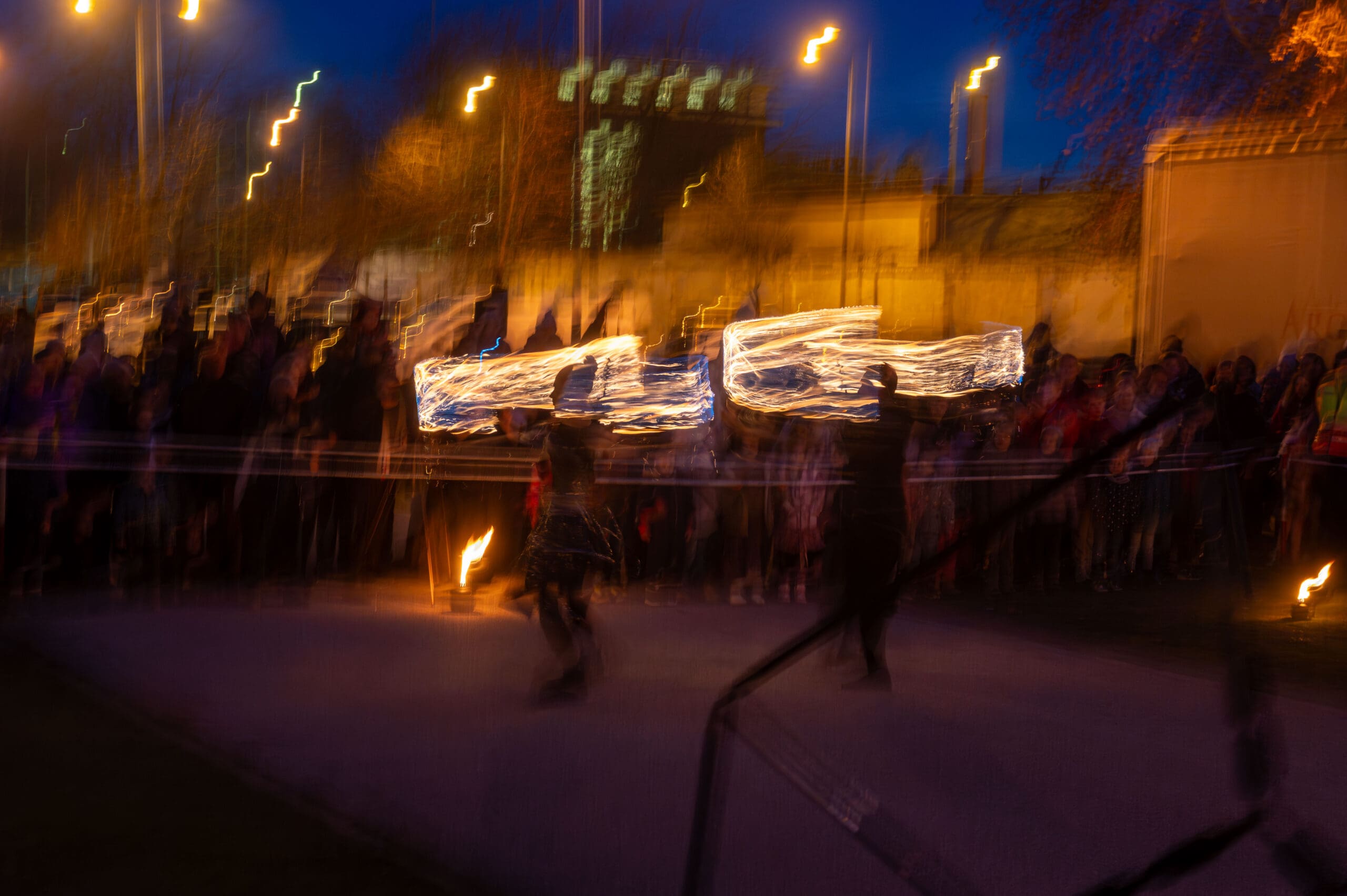 A sokszínű menetet idén is a város szelíd óriásai, a Langaléta Garabonciások vezették végig a Kossuth utcán zenebona és tánc kíséretében. A felvonulás végül a Városi Sportcsarnokhoz érkezett, ahol már lobogott az égő máglya.