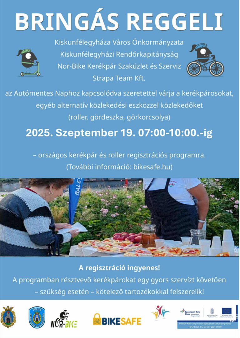 Az Autómentes naphoz kapcsolódva, Kiskunfélegyháza Város Önkormányzata, a Kiskunfélegyházi Rendőrkapitányság, a Nor-Bike Kft. és a Strapa Team Kft. idén is felhívja  a városlakók figyelmét az országos kerékpár és roller regisztrációs programra, ahol a résztvevő kerékpárokat egy kisebb szervizt követően – szükség szerint – kötelező tartozékkal is felszerelik. A szervezők idén is készülnek néhány finom falattal és meleg teával, hogy a regisztráció minél kellemesebb légkörben, egy kedélyes beszélgetés mellett valósulhasson meg. Szeretettel várnak minden érdeklődőt!