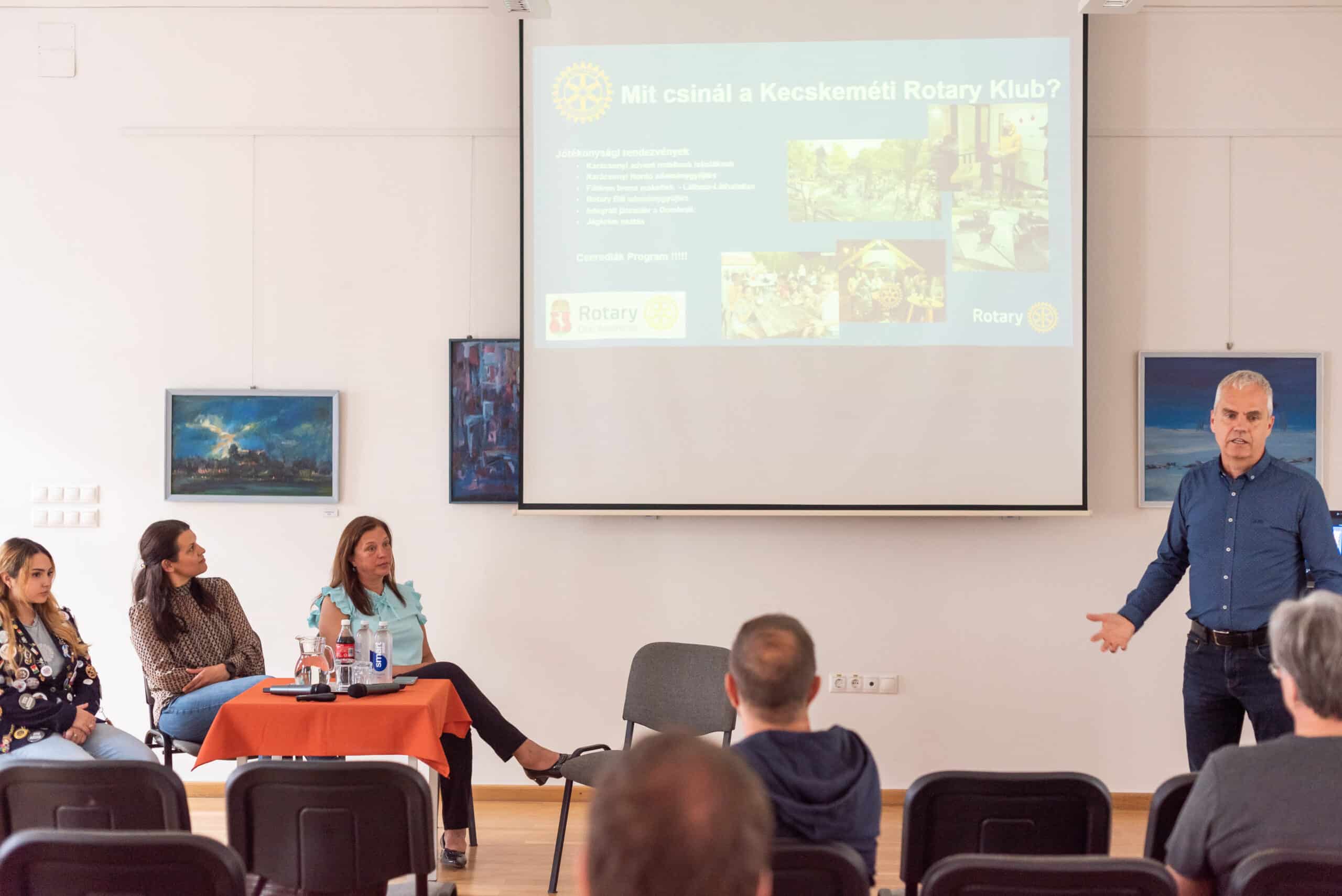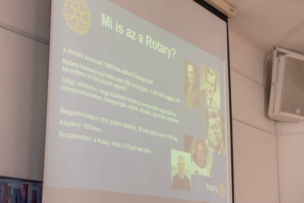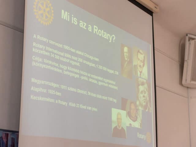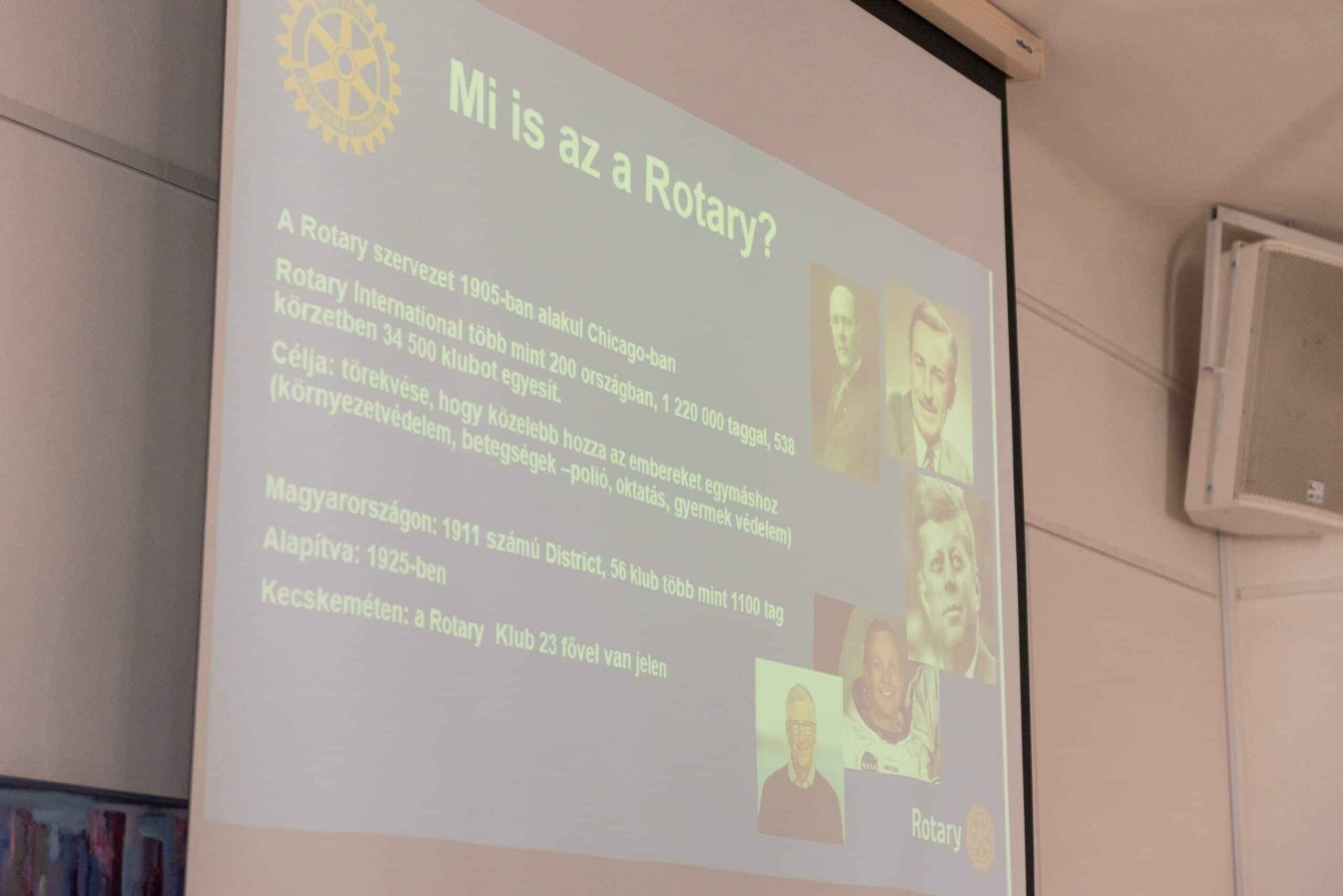 Varga Tibortól megtudtuk, hogy a Rotary szervezet 1905-ban alakult Chicago-ban, ma már a Rotary International több mint 200 országban, 1 220 000 taggal, 538 körzetben, 34 500 klubot egyesít. Célja és törekvése, hogy közelebb hozza az embereket egymáshoz. Tevékenykednek a környezetvédelem, az oktatás és gyermekvédelem területén is. Magyarországon 56 klub több mint 1100 taggal van jelen, a Kecskeméti Rotary Club 23 főt számlál. A kecskeméti klubnak több éves jótékonysági megmozdulása is van, ilyenek többek között a karácsonyi adománygyűjtések és adakozások, az integrált játszótér létrehozása, Rotary bál szervezése. Mindezek mellett népszerű cserediák programjuk is. A javarészt tengerentúli programjaik két fő csoportra bonthatók, az egyik a rövid idejű (STEP) és a hosszú utas program (LTEP). Előbbi ismérvei, hogy a Rotarynak köszönhetően két különböző országbeli családot összehoznak, a diákok ezekhez a családokhoz utaznak 1 – 1,5 hónapra. Ez a program inkább az ország megismerését szolgálja. A hosszú utas cserediák program célországai: Brazília, Mexikó, Tajvan, Japán, USA, Kanada. Itt egy iskolai évet tölt el a diák a fogadó családoknál (szeptembertől- júniusig) és részt vesz a helyi oktatásban. A cserediák a meghatározott szabályok betartása mellet megismeri adott ország nyelvét, szokásait, mindennapjait, oktatását. Szervezett utazásokon vehet rész, amit a családok, a klub vagy a disctrict szervez.