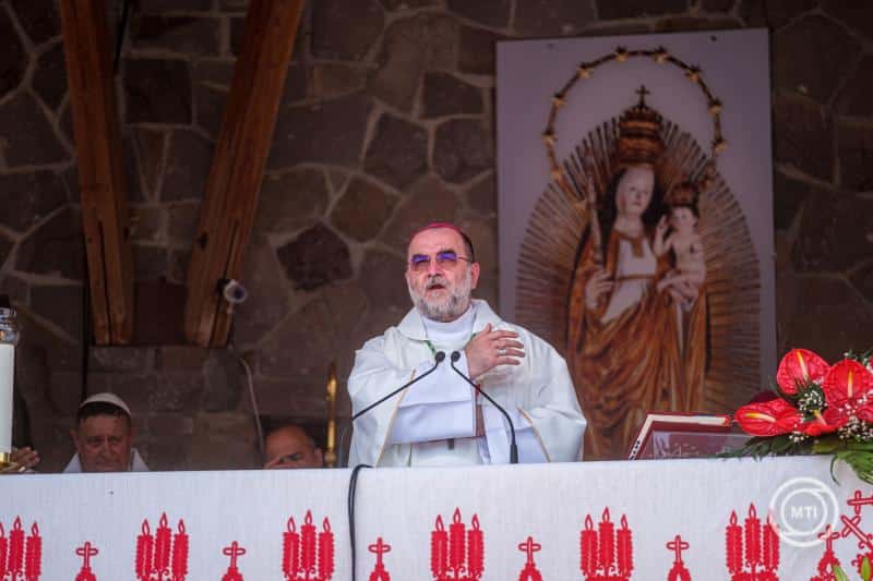 Kérte a zarándokokat, hogy miután megtanították családjukat imádkozni, vegyék észre a Szűzanya könnyeit is. "Máriának most is van oka a sírásra" - mondta az ukrajnai háborúra utalva; azért sír, mert mindkét háborúzó nép a gyermeke, mélyen Mária-tisztelő nemzet, akárcsak a magyarok és a románok. "Minden nemzet a Kárpát-medencében, mindannyian Mária gyermekei vagyunk" - jelentette ki. Ne csak könnyeiket, hanem örömüket, hálájukat is vigyék el Máriához, ne csak kérjenek, hanem adjanak is - mondta. Szerető jelenlétre intette a híveket a szenvedőkkel és elesettekkel való találkozásban, most, a közömbösség, a közönyösség, az elmagányosodás időszakában. "Legyünk életünk tevékeny szeretetével mások boldogságának okai, szerzői!" - kérte.
