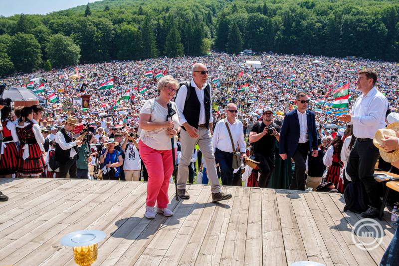 Sulyok Tamás köztársasági elnök és felesége, Nagy Zsuzsanna (középen j-b) megérkezik a csíksomlyói búcsú szentmiséjére a Kis- és Nagy-Somlyó-hegy közötti hegynyeregbe, a Hármashalom-oltárhoz.