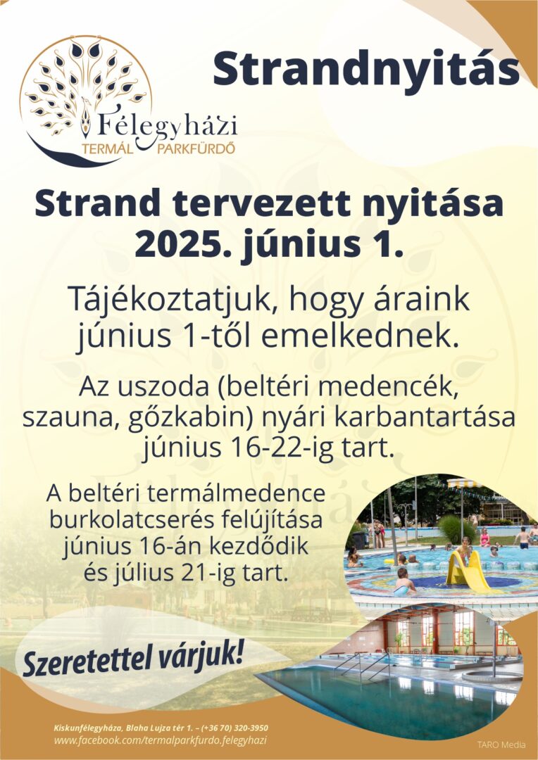 Ahogy az elmúlt években megszokhattuk, idén is június 1-jén indul a nyári szezon a Félegyházi Termál Parkfürdőben. A meteorológia szerint verőfényes, igazi strandidővel kezdődik a nyár, így nemcsak a medencék, de a napozóágyak és az árnyas pihenőhelyek is gyorsan megtelhetnek majd.