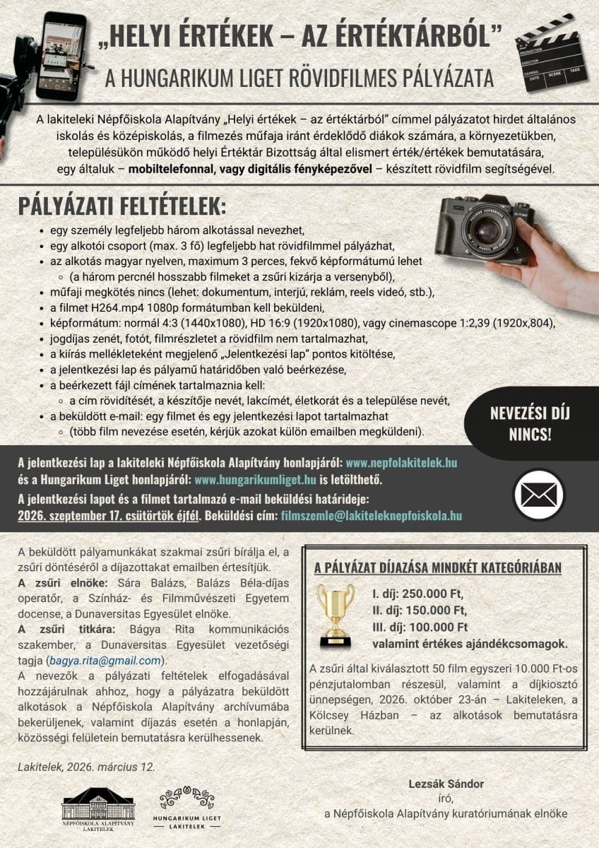 Az eredményhirdetésre és a díjátadó ünnepségre 2026. október 23-án kerül sor Lakiteleken, ahol a kiválasztott alkotásokat be is mutatják a közönségnek.