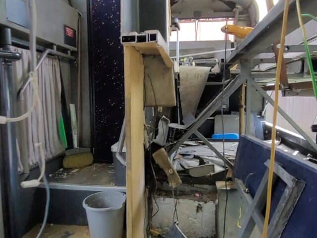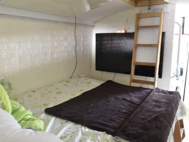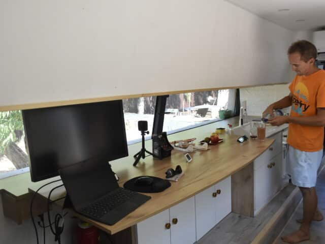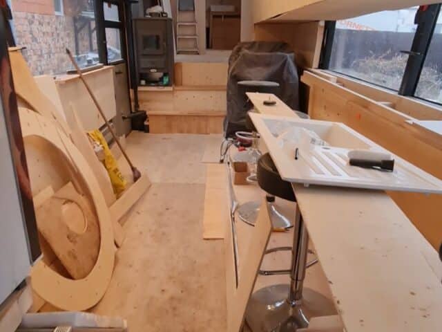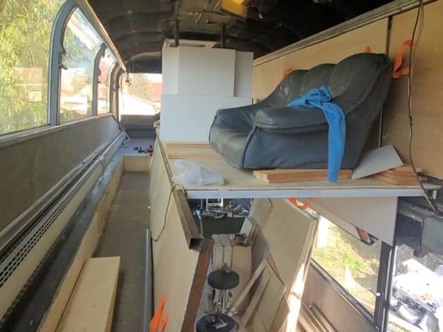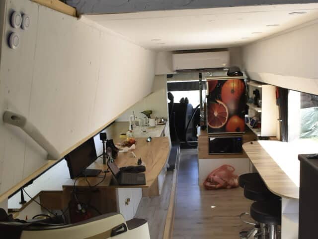 A belső tér átalakítása hónapokat vett igénybe. Először eltávolította az összes ülést és kalaptartót, majd kivágta a középső szint nagy részét, hogy megnövelje a belmagasságot. Az így nyert tágas tér lehetőséget adott arra, hogy a busz valóban otthonos és praktikus legyen. 2025 júniusától a busz hivatalosan is lakható. A bejáratnál egy jól felszerelt, kényelmes konyha fogadja a látogatót, innen nyílik a nappali, ahol a bútorok részben bontott anyagokból, részben helyi üzletekből vagy az internetről beszerzett darabokból állnak össze. A modern és praktikus fürdőszoba mellett egy hálószoba is helyet kapott, ahol projektor és okostévé biztosítják az esti kikapcsolódást.