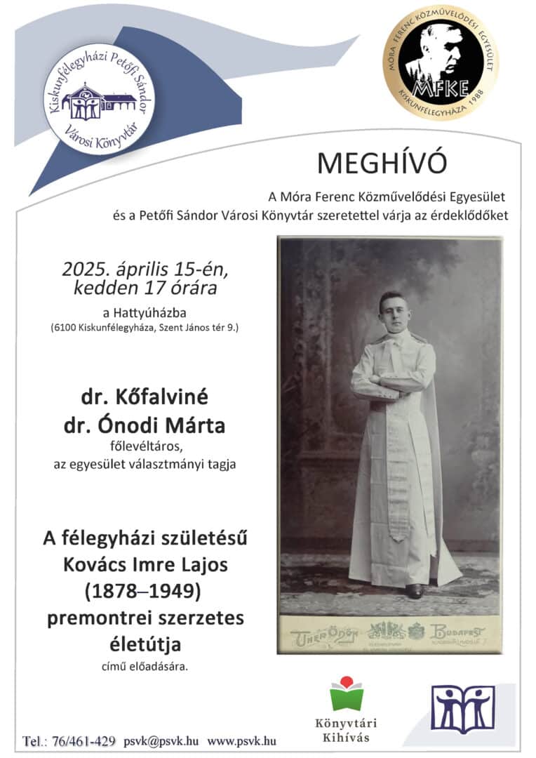 Dr. Kőfalviné dr. Ónodi Márta főlevéltáros, a Móra Ferenc Közművelődési Egyesület tagja április 15-én, kedden 17 órai kezdettel előadást tart a félegyházi születésű Kovács Imre Lajos premontrei szerzetes életéről. Az eseménynek a Kiskunfélegyházi Petőfi Sándor Városi Könyvtár ad otthont.