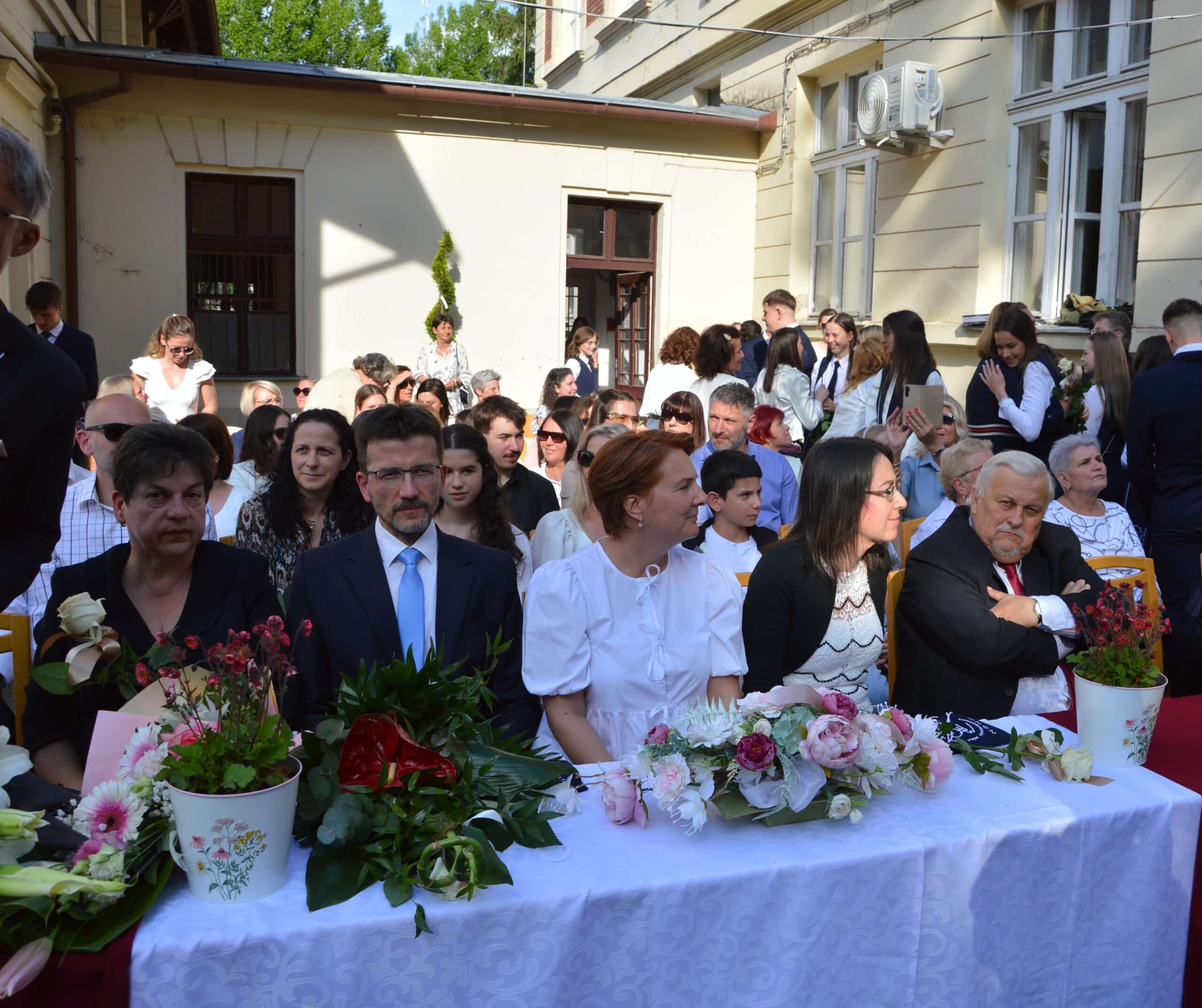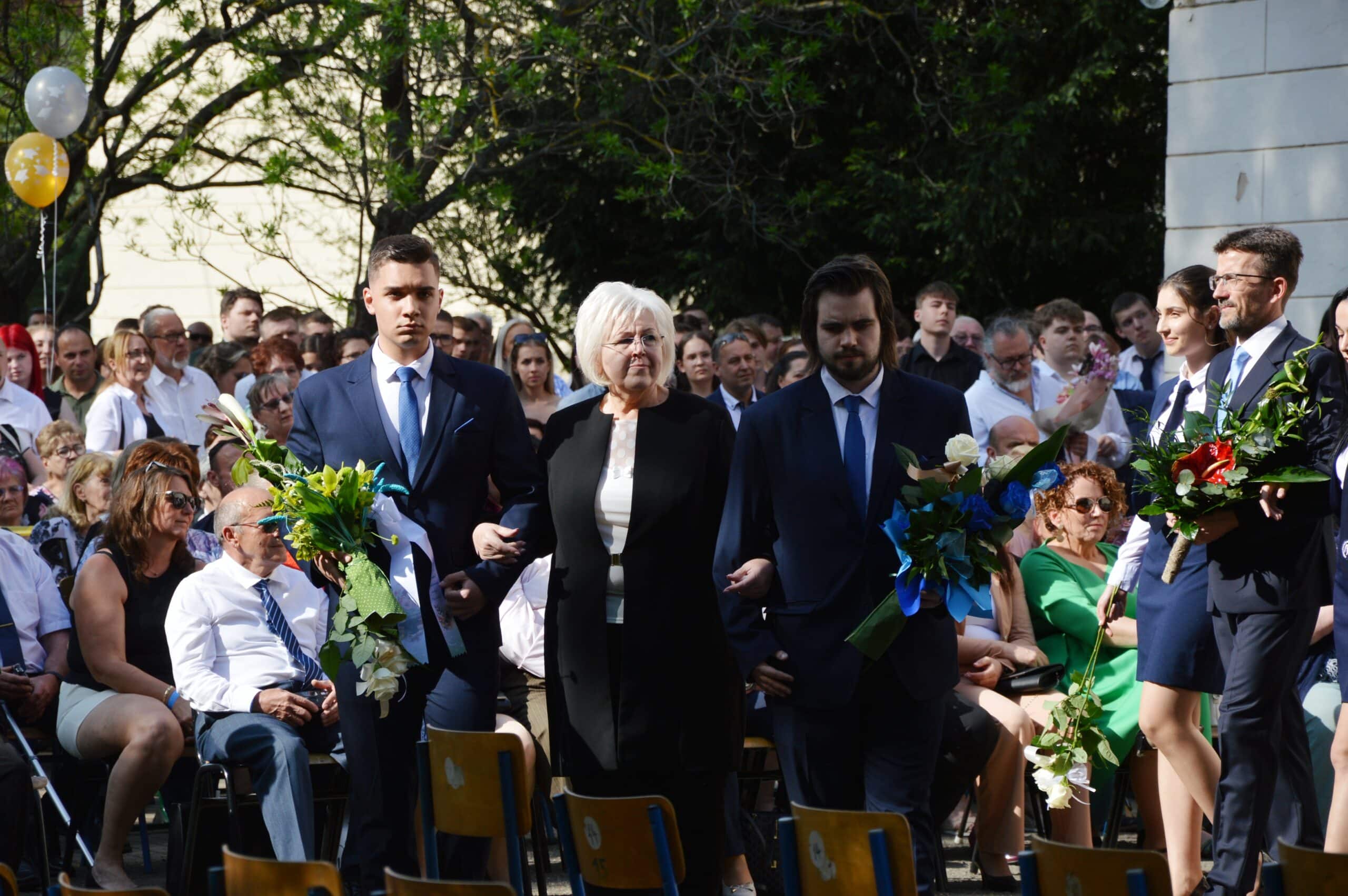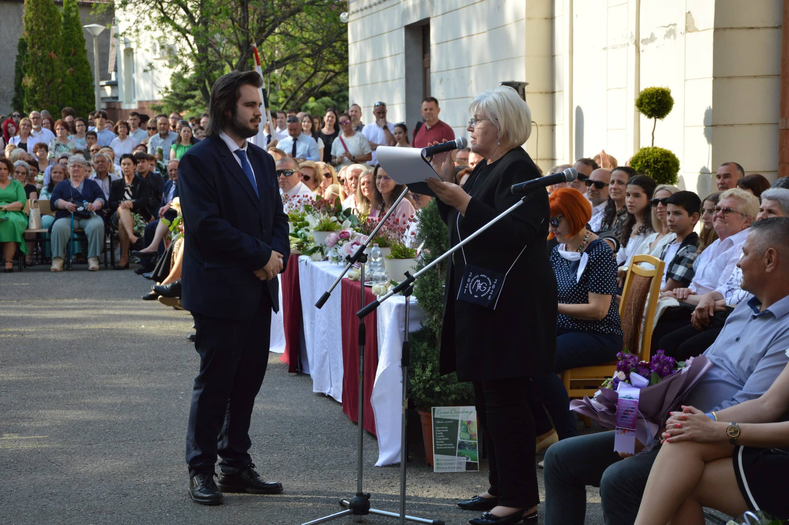 – Picikéim! Először is gyönyörűek vagytok! Nem könnyű évről-évre okosat és szépet mondani, pedig bennünk van az igény az új és frappáns köszöntő megírására. Igyekszünk kerülni a sablonos szavakat: a nagybetűs élet, felnőtté válás, megmérettetés, érettségi… de bizony ez a nap ezekre az élethelyzetekre is emlékeztet bennünket. Mert az előttetek álló időszak a számadásról szól, amely után bejárjátok a felnőtté válás útját, és ha tetszik, ha nem, kikerültök abba a bizonyos nagybetűs életbe. Most viszont pár hétig még élvezhetitek középiskolás éveiteket, ahol eljutottatok ifjúságotok azon szakaszába, amikor lehetőségként egy hatalmas adományt kaptatok. Magatok és társaitok megismerését, a tudást és erkölcsi értékeket. A gyermekkorhoz képest már érett fejjel tudjátok, hogy kik vagytok, honnan jöttetek és hová tartotok. A gimnázium védőhálója nem sokáig burkol már benneteket. Új közösségbe kerültök, ahol a siker kulcsa a beilleszkedés, a tudás megőrzése és életen át tartó fejlesztése. Egyre inkább nemcsak magatoknak, másoknak is számadással tartoztok. Az életben való helytálláshoz tanáraitok adták nektek a tudás megszerzésének néha keserű, de remélem többnyire édes ízét, a sokoldalúság és a megújulás képességének megőrzését. Legyetek büszkék arra, hogy részesei lehettetek az általunk nyújtott tudás megszerzésére. Mi büszkék vagyunk erre és arra, hogy mi adhattuk át nektek. Ezekkel az értékekkel és Lipták Mariann gondolataival kívánom, hogy ilyen életet éljetek – fogalmazott.