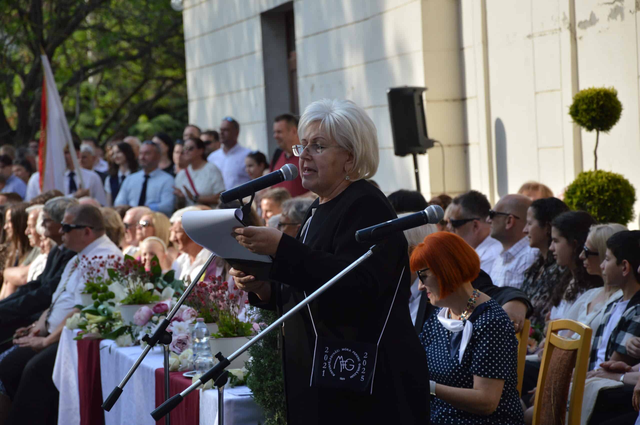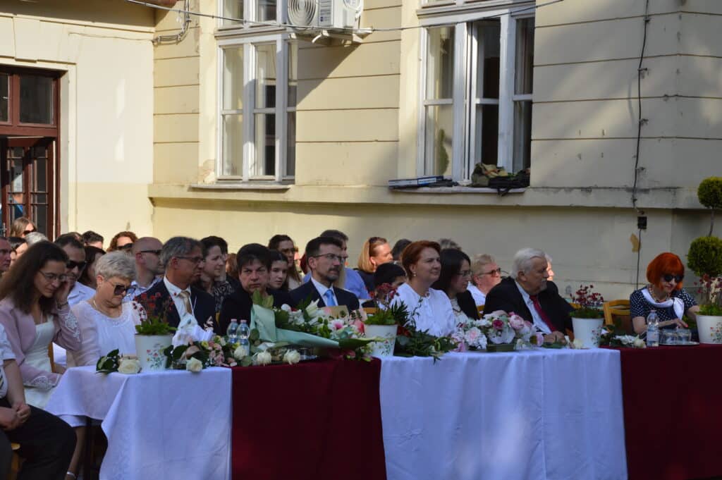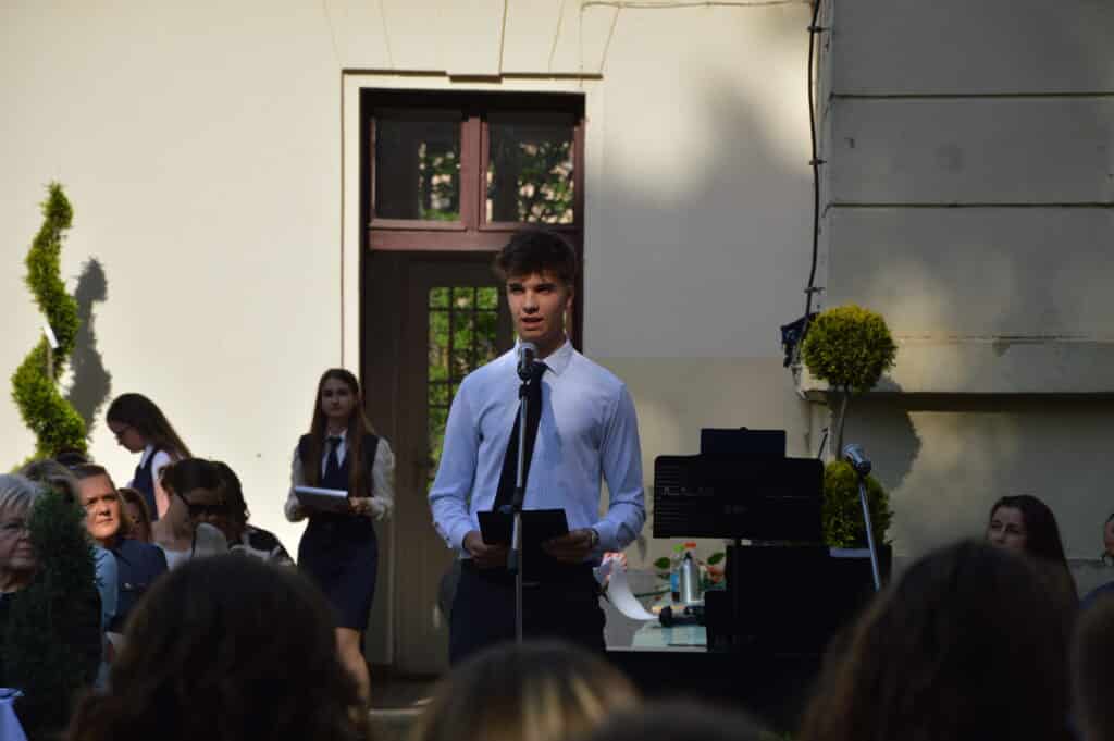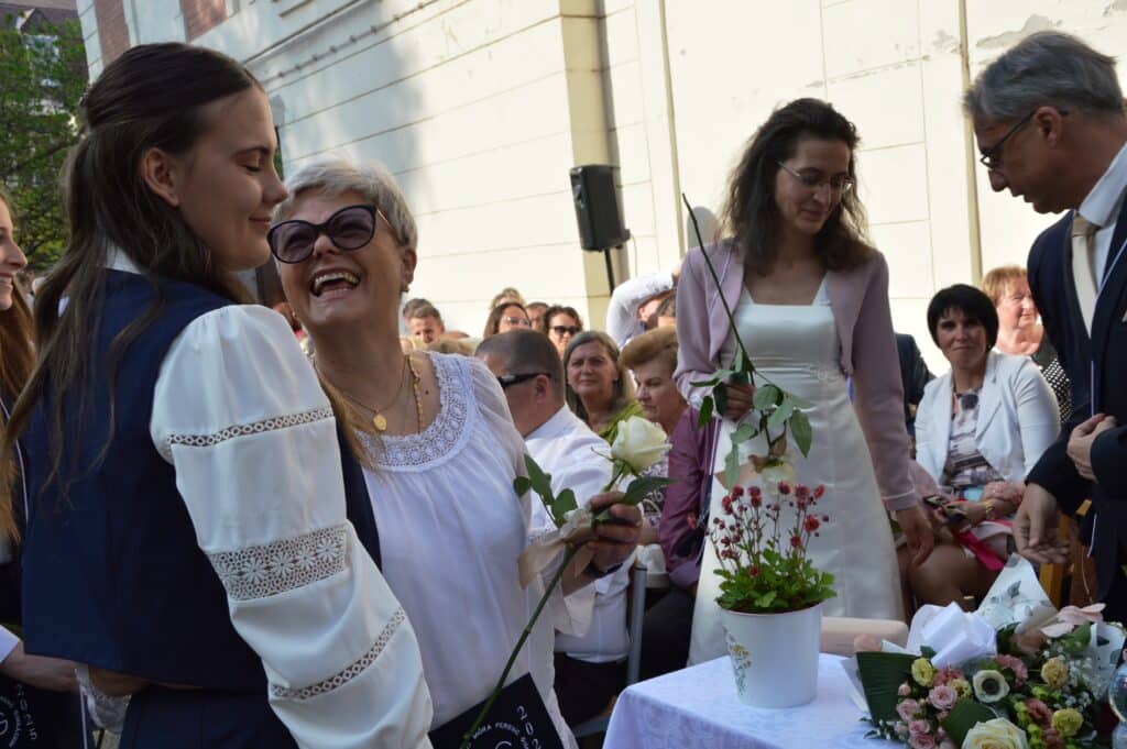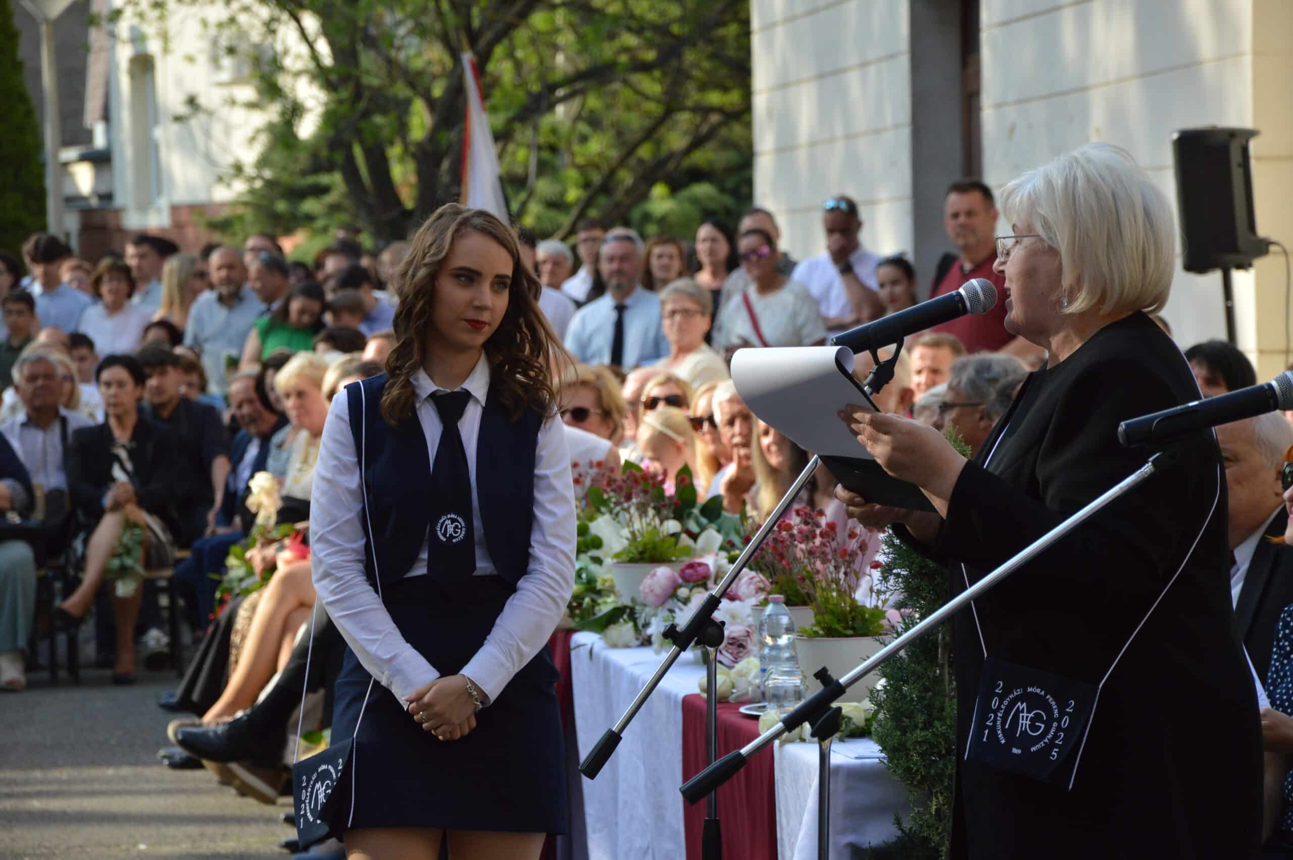 – Picikéim! Először is gyönyörűek vagytok! Nem könnyű évről-évre okosat és szépet mondani, pedig bennünk van az igény az új és frappáns köszöntő megírására. Igyekszünk kerülni a sablonos szavakat: a nagybetűs élet, felnőtté válás, megmérettetés, érettségi… de bizony ez a nap ezekre az élethelyzetekre is emlékeztet bennünket. Mert az előttetek álló időszak a számadásról szól, amely után bejárjátok a felnőtté válás útját, és ha tetszik, ha nem, kikerültök abba a bizonyos nagybetűs életbe. Most viszont pár hétig még élvezhetitek középiskolás éveiteket, ahol eljutottatok ifjúságotok azon szakaszába, amikor lehetőségként egy hatalmas adományt kaptatok. Magatok és társaitok megismerését, a tudást és erkölcsi értékeket. A gyermekkorhoz képest már érett fejjel tudjátok, hogy kik vagytok, honnan jöttetek és hová tartotok. A gimnázium védőhálója nem sokáig burkol már benneteket. Új közösségbe kerültök, ahol a siker kulcsa a beilleszkedés, a tudás megőrzése és életen át tartó fejlesztése. Egyre inkább nemcsak magatoknak, másoknak is számadással tartoztok. Az életben való helytálláshoz tanáraitok adták nektek a tudás megszerzésének néha keserű, de remélem többnyire édes ízét, a sokoldalúság és a megújulás képességének megőrzését. Legyetek büszkék arra, hogy részesei lehettetek az általunk nyújtott tudás megszerzésére. Mi büszkék vagyunk erre és arra, hogy mi adhattuk át nektek. Ezekkel az értékekkel és Lipták Mariann gondolataival kívánom, hogy ilyen életet éljetek – fogalmazott.
