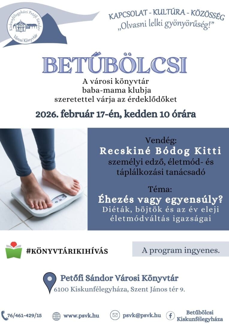 A kiskunfélegyházi Petőfi Sándor Városi Könyvtár Betűbölcsi programja ezúttal is aktuális és sokakat érintő témát választott. A baba-mama klub vendége Recskiné Bódog Kitti személyi edző, életmód- és táplálkozási tanácsadó lesz, aki „Éhezés vagy egyensúly? – Diéták, böjtök és az év eleji életmódváltás igazságai” címmel tart előadást.