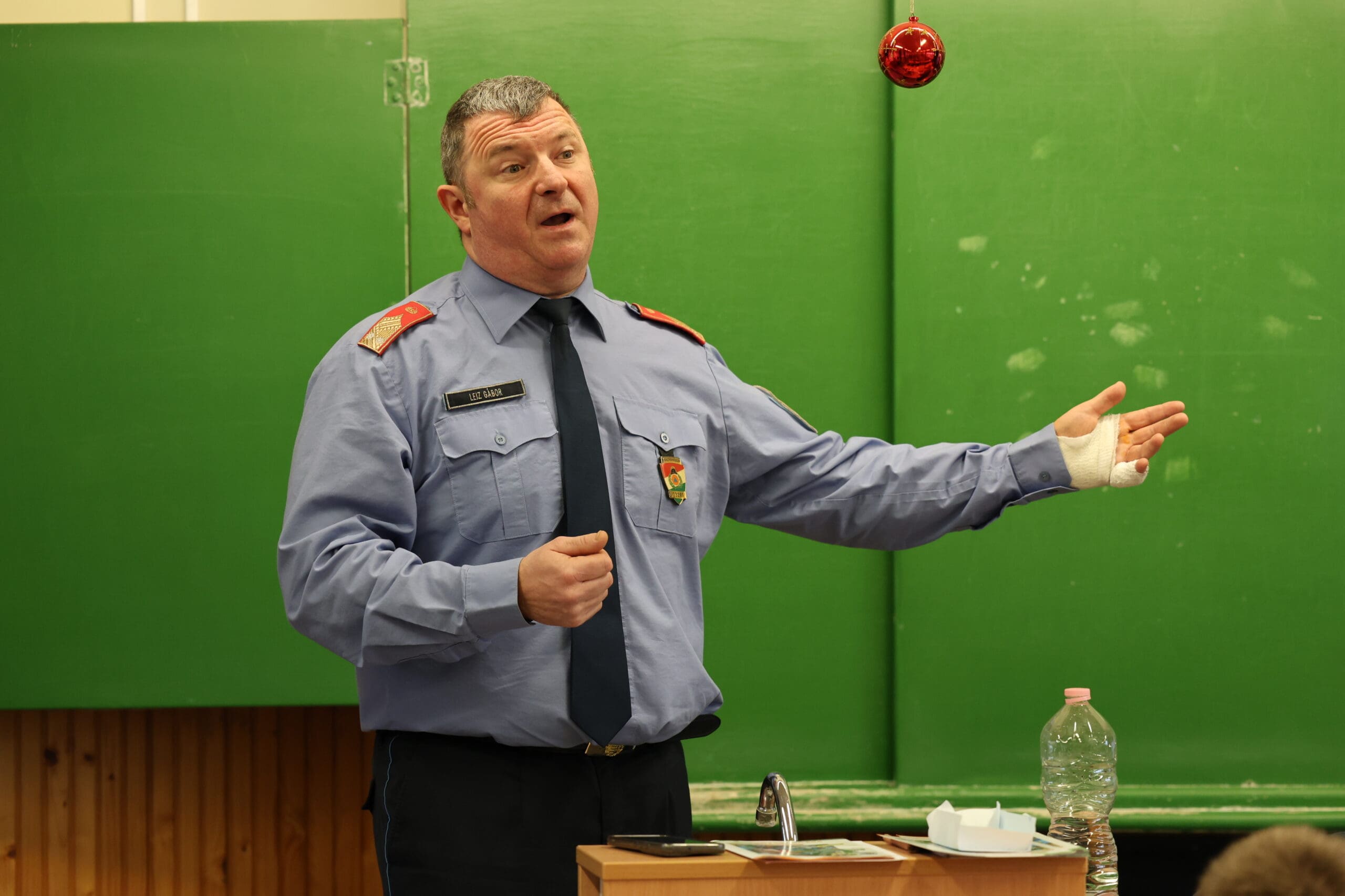 A tűzoltóparancsnok részletes tájékoztatást és gyakorlati tanácsokat adott a tanulóknak, hogy mire figyeljenek, hogy megelőzhetőek legyenek a tragikus kimenetelű tűzesetek.
