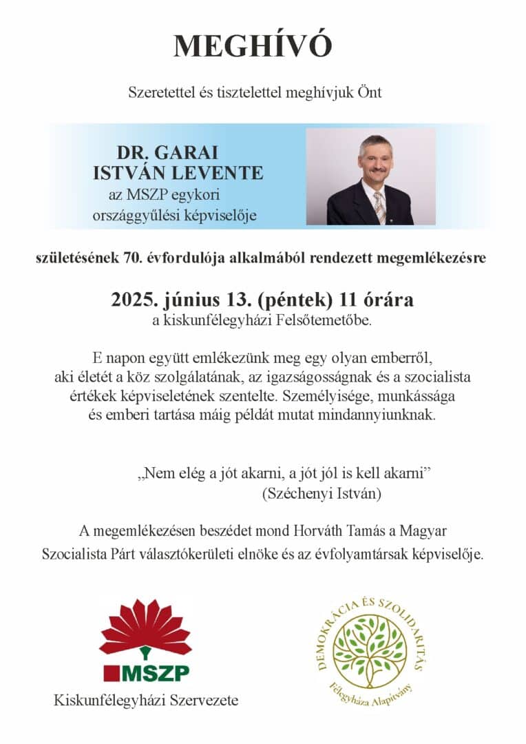 Dr. Garai István neve összefonódott Kiskunfélegyháza egészségügyi és közéleti fejlődésével. Képviselőként és gyógyítóként is fáradhatatlanul dolgozott a közjóért, mindig emberséggel, szakértelemmel és elhivatottsággal fordult mások felé. Az eseményen beszédet mond Horváth Tamás, a Magyar Szocialista Párt választókerületi elnöke és az évfolyamtársak képviselője. A megemlékezés szervezője az MSZP Kiskunfélegyházi Szervezete és a Demokrácia és Szolidaritás Félegyháza Alapítvány.