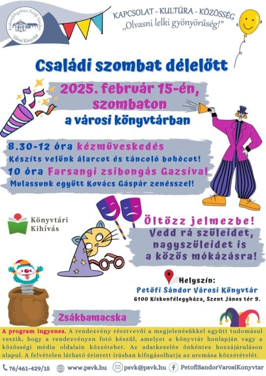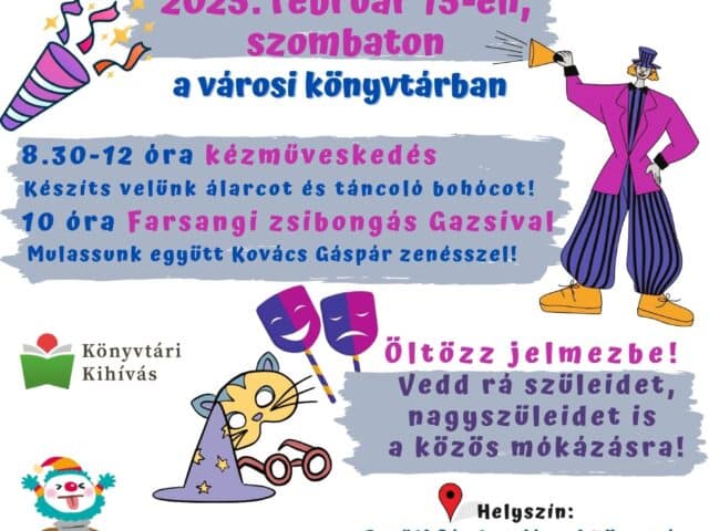 Farsangi délelőttre várják a családokat február 15-én, szombaton a Kiskunfélegyházi Petőfi Sándor Városi Könyvtárba.