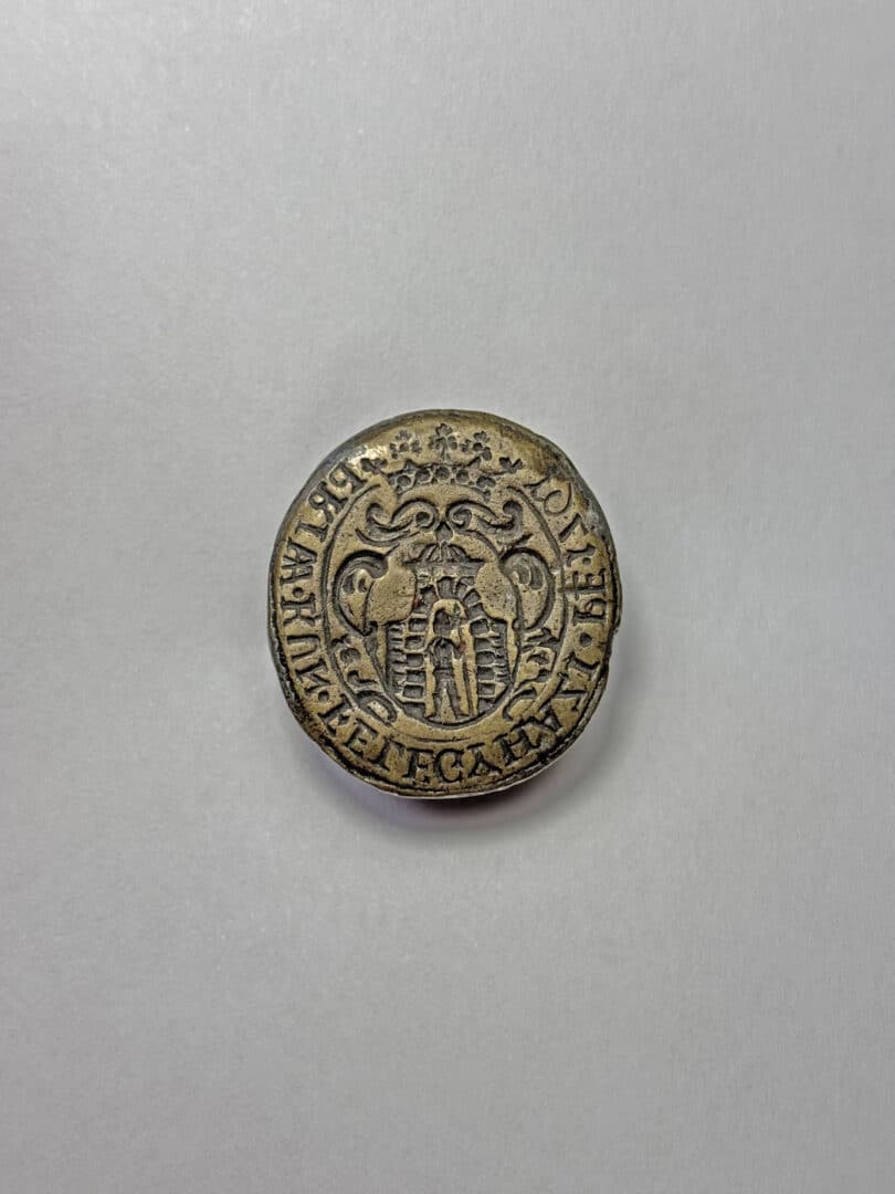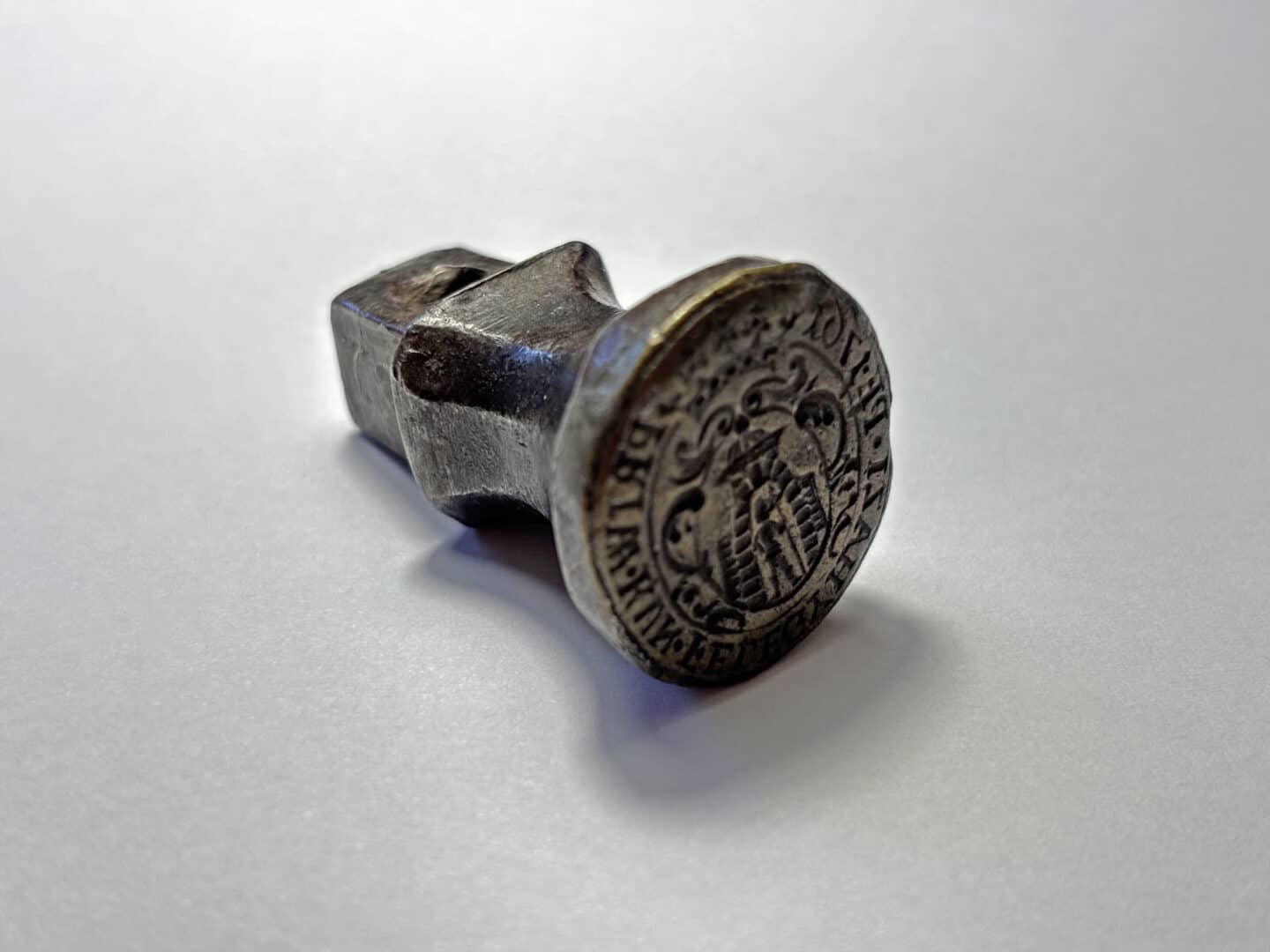 - A címer tetején ötágú korona található, amely belelóg a pecsét köriratába. A korona alatt tetős, kőből emelt torony kapujában, jobb kezében kopját tartó vitéz alakja tűnik elő. Jobbról és balról címertakarót véstek a pecsétre.