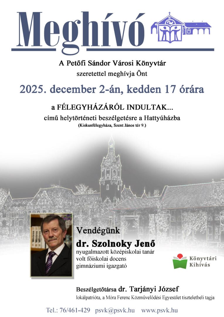 A Félegyházáról indultak helytörténeti beszélgetés-sorozat következő eseményére december 2-án, 17 órakor kerül sor a Kiskunfélegyházi Petőfi Sándor Városi Könyvtárban.
