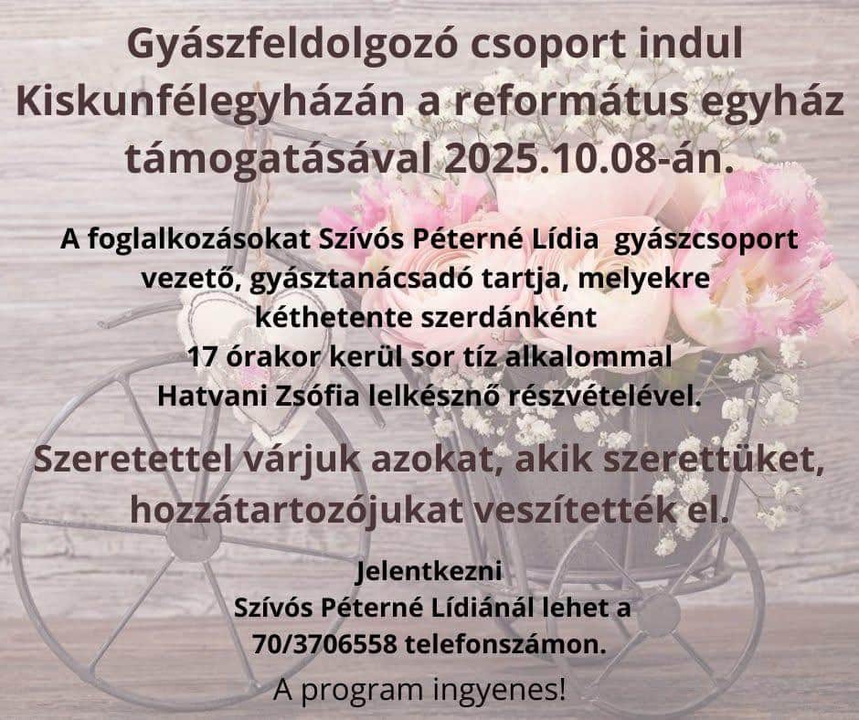 Kiskunfélegyházán a református egyház támogatásával gyászfeldolgozó csoport indul október 8-án, ami lehetőséget kínál azoknak, akik szerettüket, hozzátartozójukat veszítették el, és támogatásra, közösségre vágynak ebben a nehéz időszakban. A foglalkozásokat Szívós Péterné Lídia, gyászcsoport-vezető és gyásztanácsadó tartja, Hatvani Zsófia lelkésznő közreműködésével.