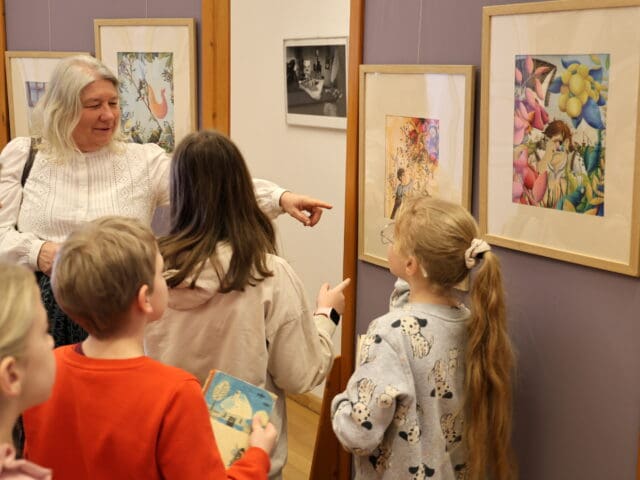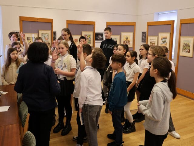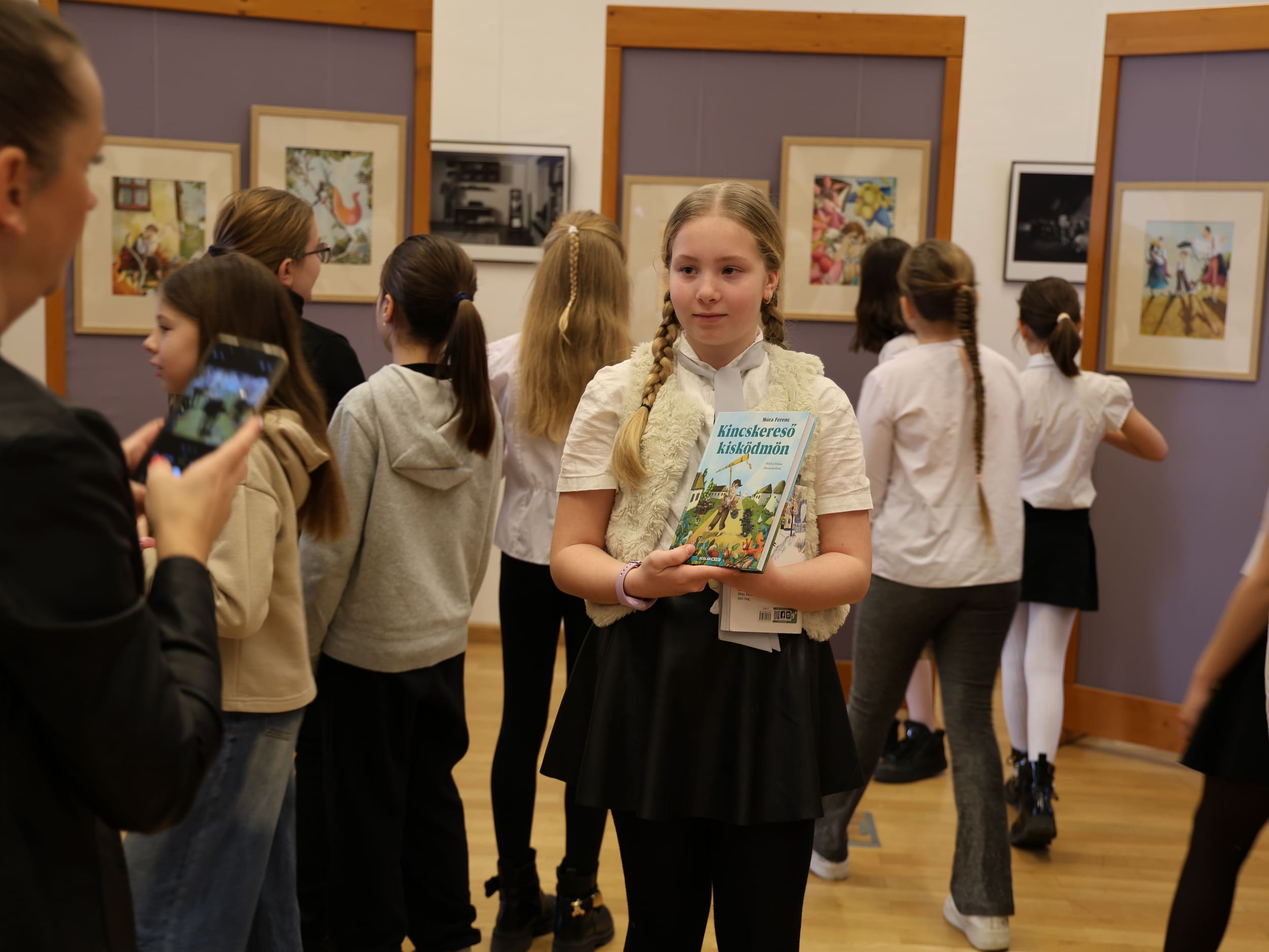 A diákok ezt követően a kamaraterembe vonultak, ahol Kapus Béláné, a Móra Ferenc Közművelődési Egyesület örökös tiszteletbeli elnöke vezetésével egy különleges illusztráció-felismerő játék várt rájuk. A Kincskereső kisködmön legújabb kiadását Miklya Emese rajzai díszítik, ezekből a munkákból tizenkét illusztrációt állítottak ki a könyvtár kamaratermében. A játékos feladat során azok a gyerekek, akik ügyesen felismerték, melyik kép a történet melyik fejezetéhez kapcsolódik, jutalmul egy mézeskalácsból készült malomházat kaptak.