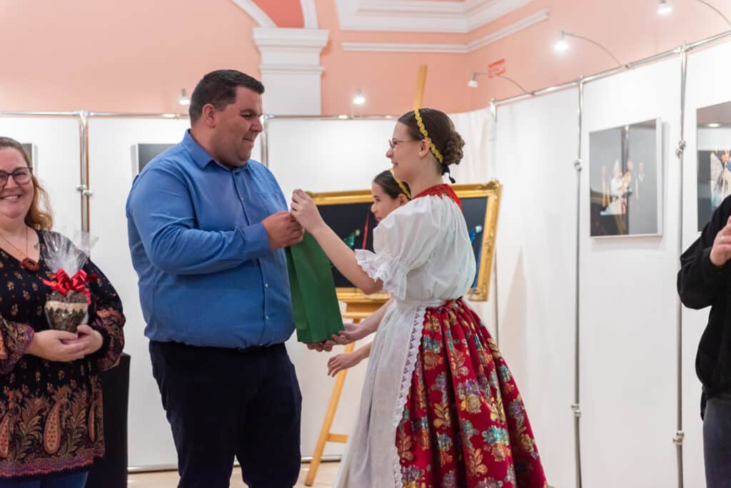 A megnyitó következő felszólalója Gulyás László vándormuzsikus volt, aki személyes élményeit is megosztotta a kiállítókkal kapcsolatban. Mint mondta, műveikben visszatükröződik a magyar kultúrához való mély kötődésük. Mónikával már régóta ismerik egymást, ugyanis a Padkaporos Táncegyüttes indulásakor közösen dolgoztak az egyesület ügyein.